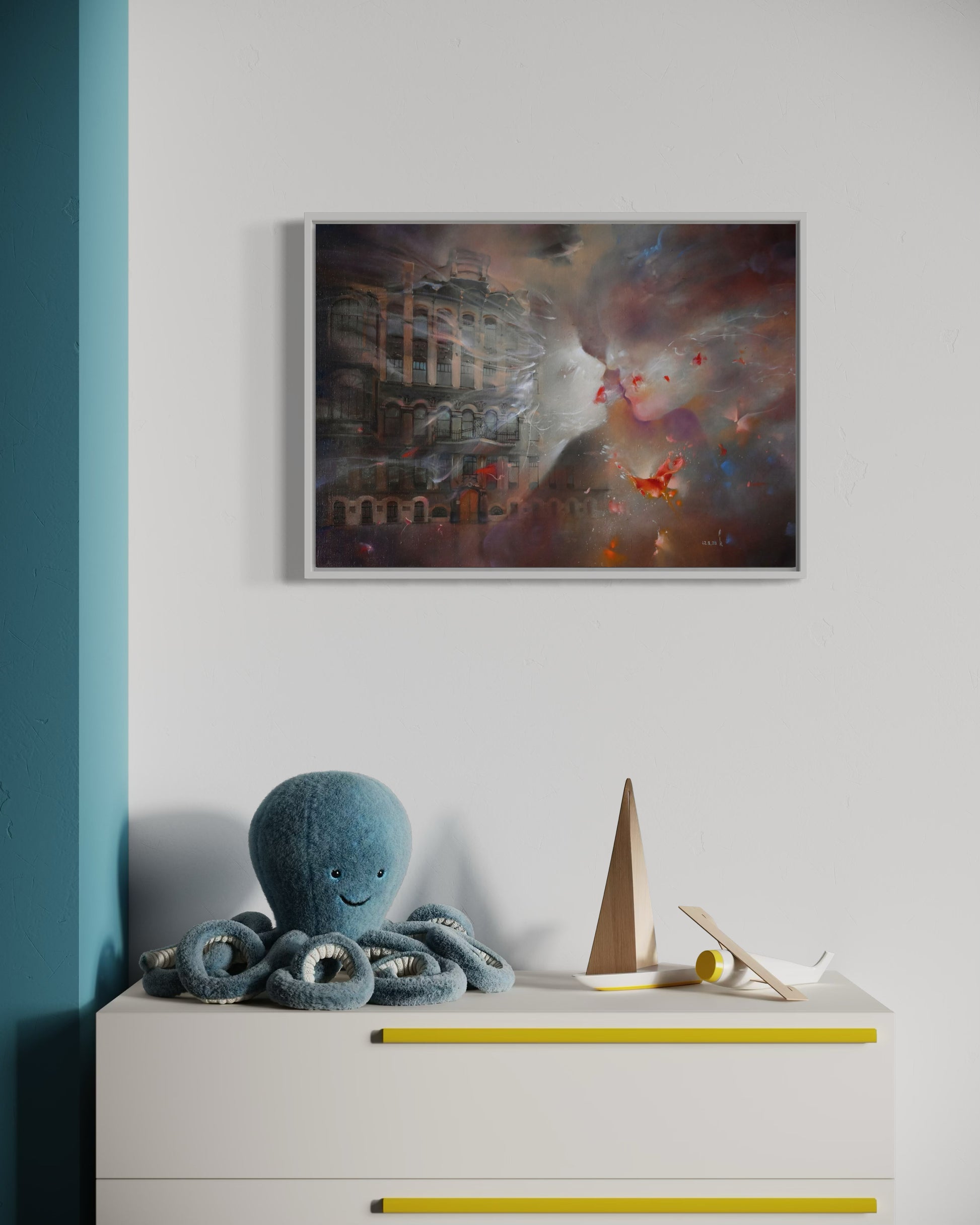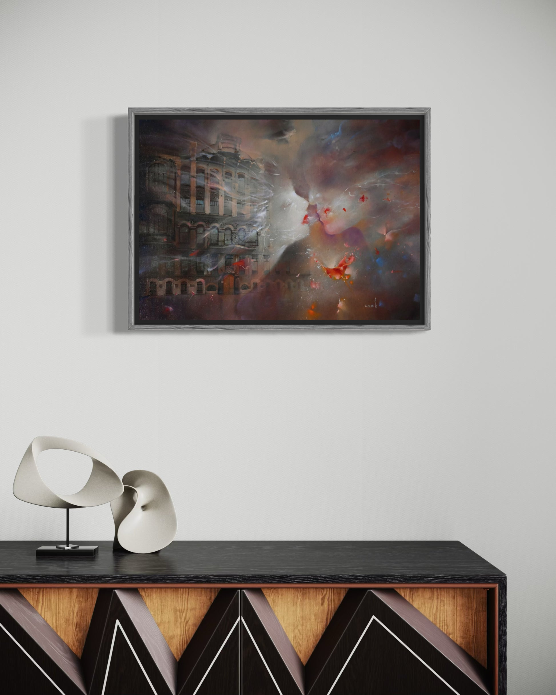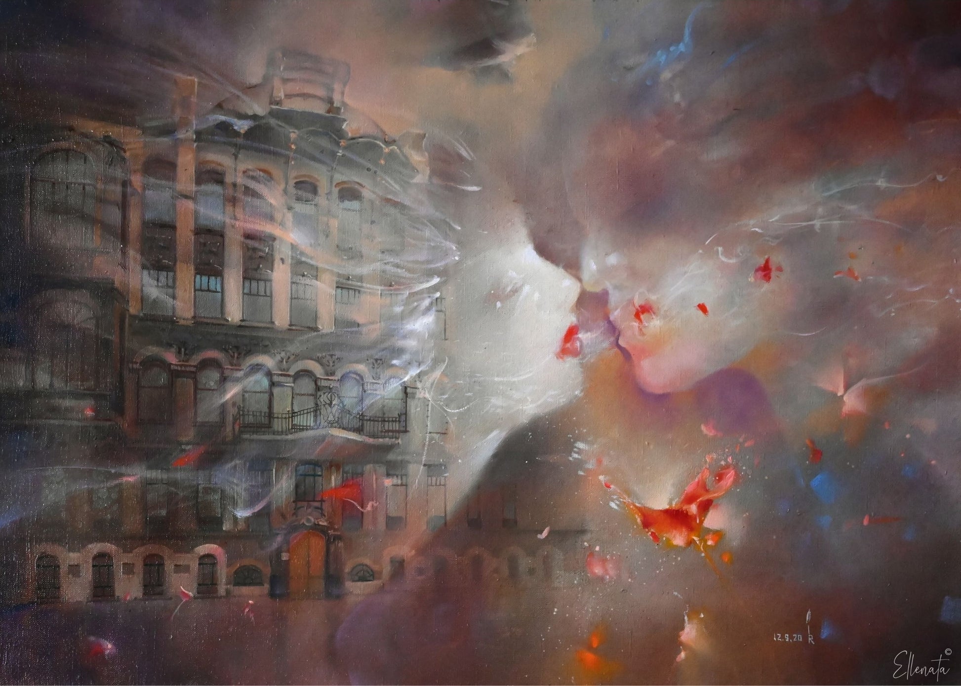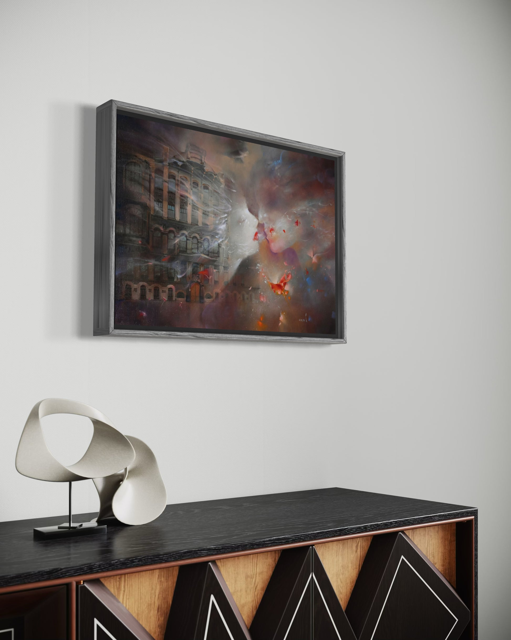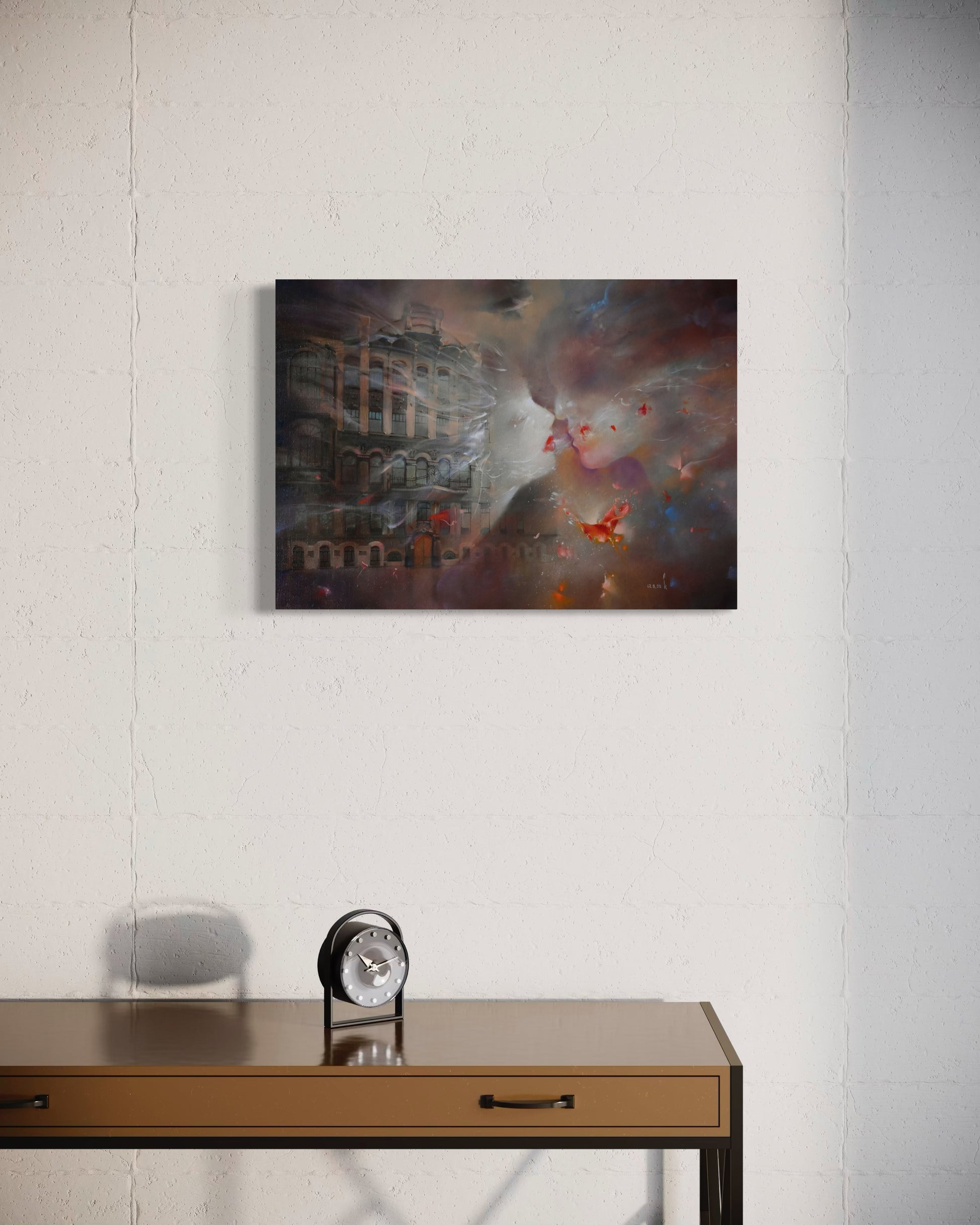 A kiss never landed, but it lingered. Two faces drift toward each other-soft as smoke, full of longing. Below, the city fades, as if the world itself pauses for a moment that never quite arrives.