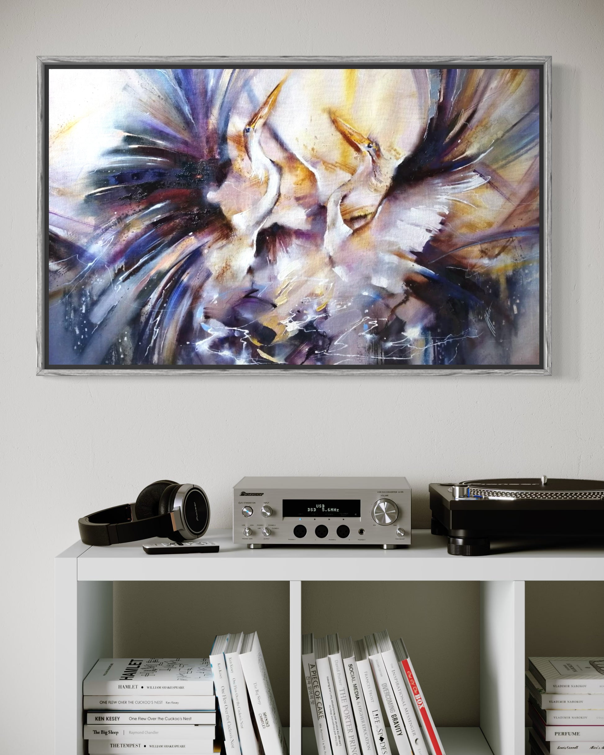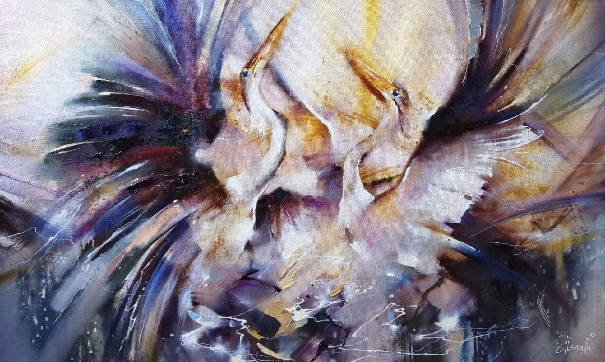 Two elegant birds rise into the air, their wings spreading soft colors like a splash of light and motion. A moment of freedom and beauty, caught in flight.