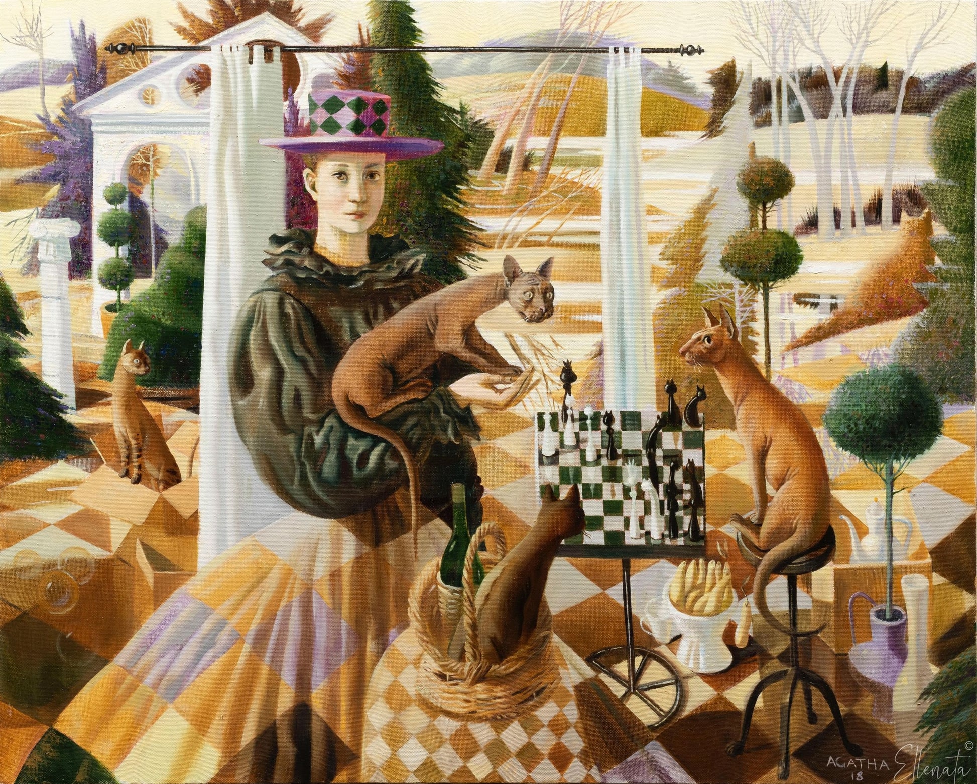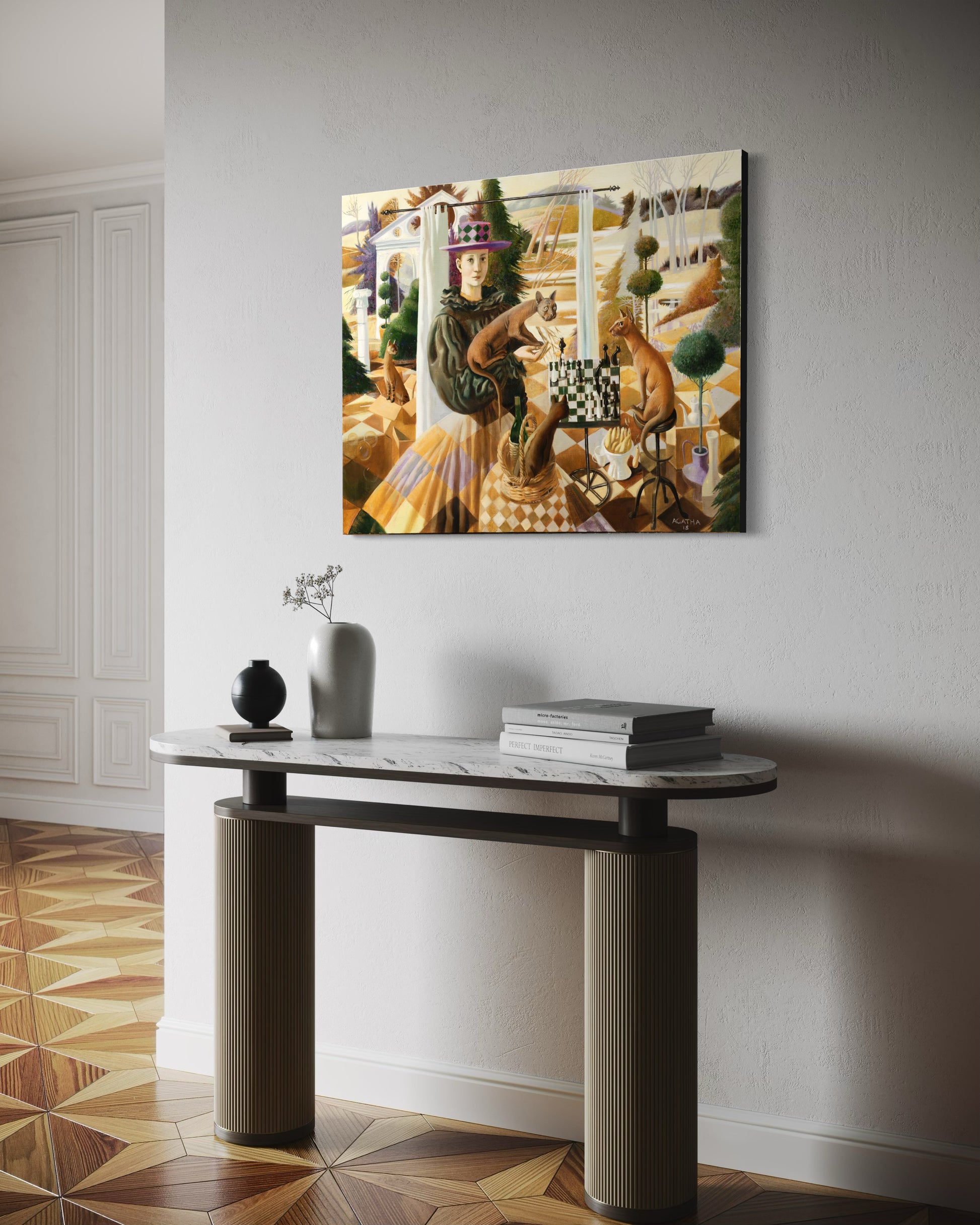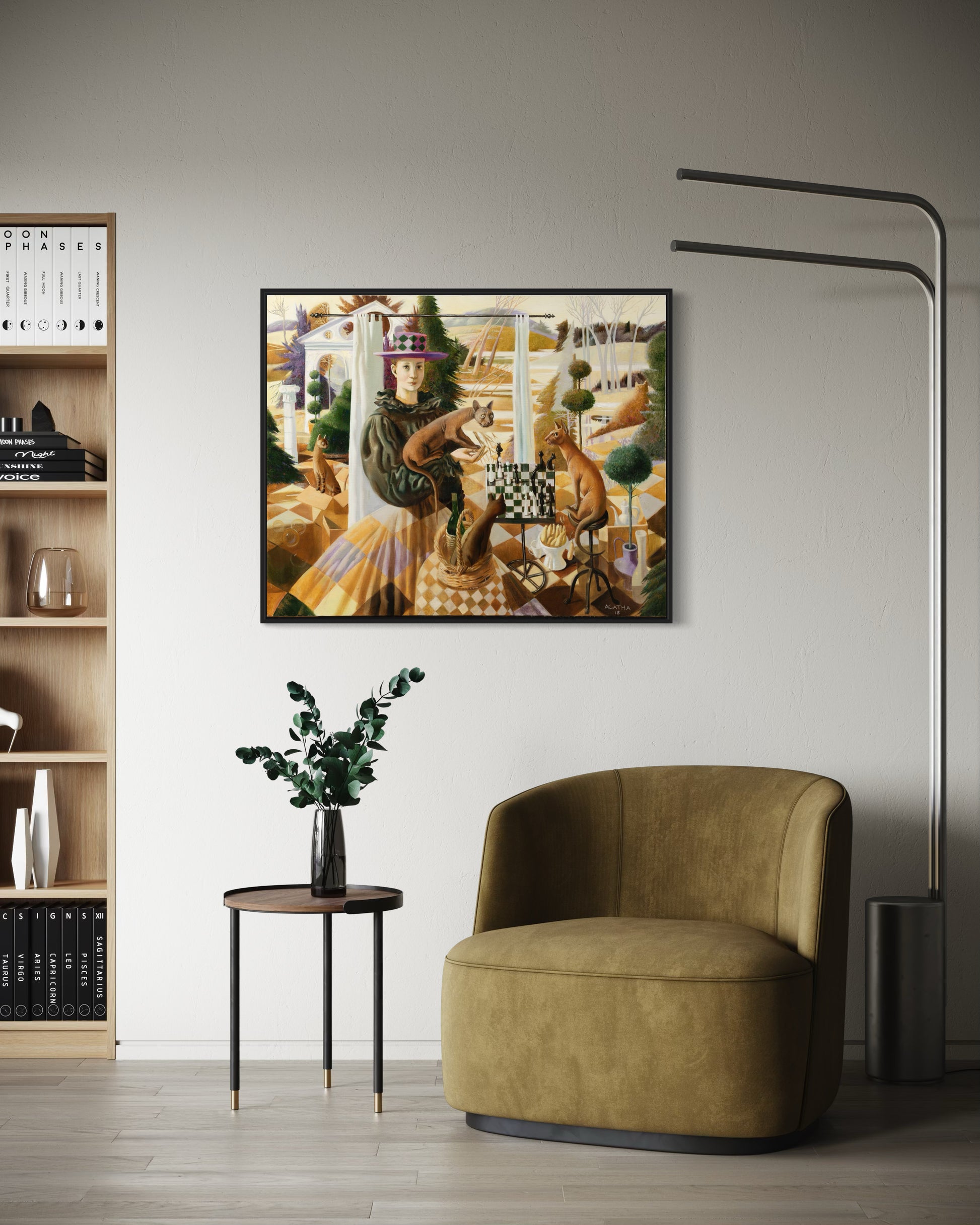 A game is on - but who is really playing? In this strange and dreamy world, cats study the board while the woman stands still, almost part of the puzzle. It is not just chess. It is a quiet mystery wrapped in warm colors, waiting for your move.