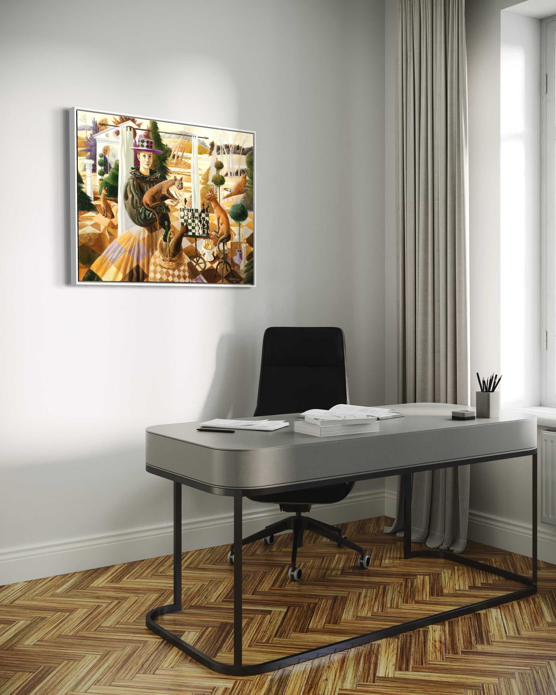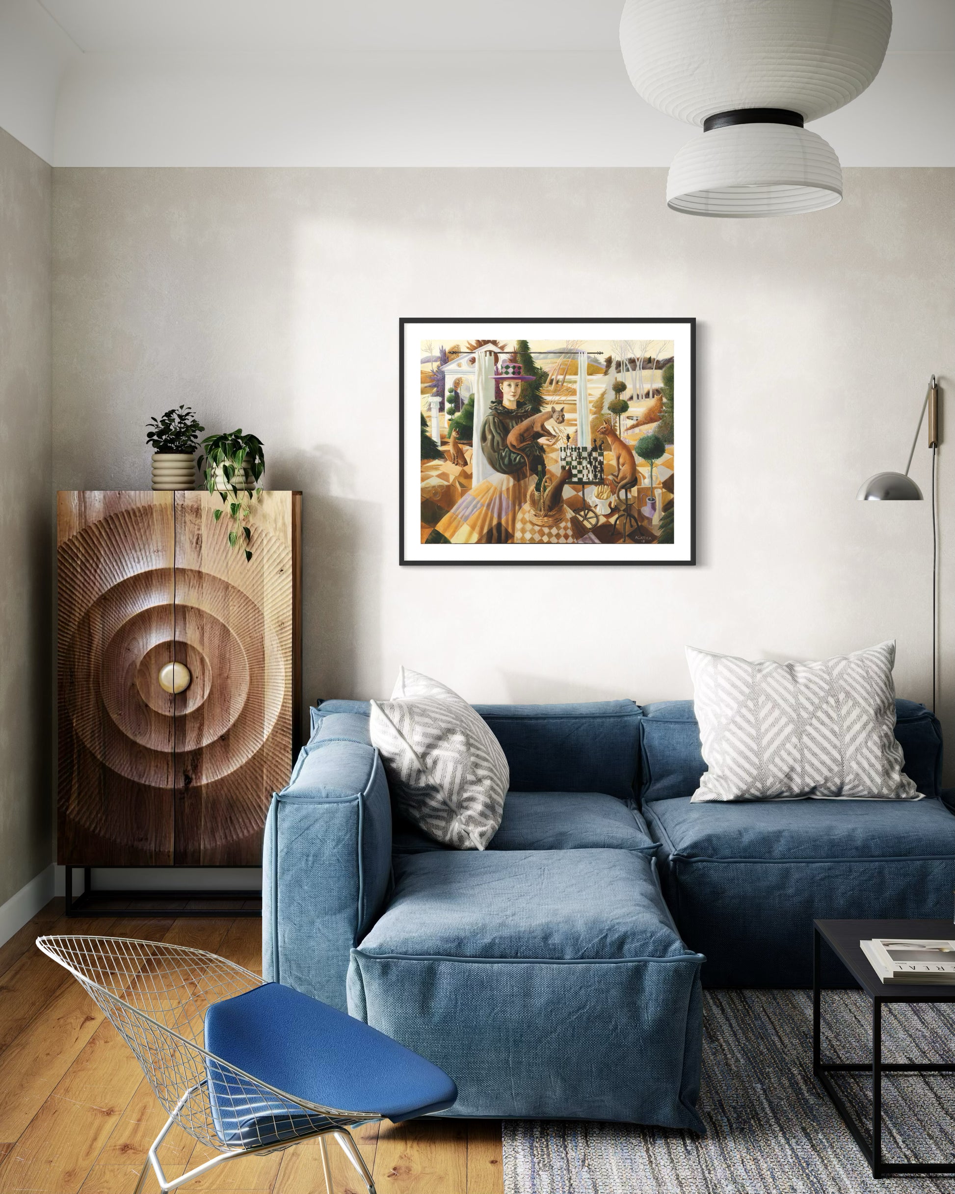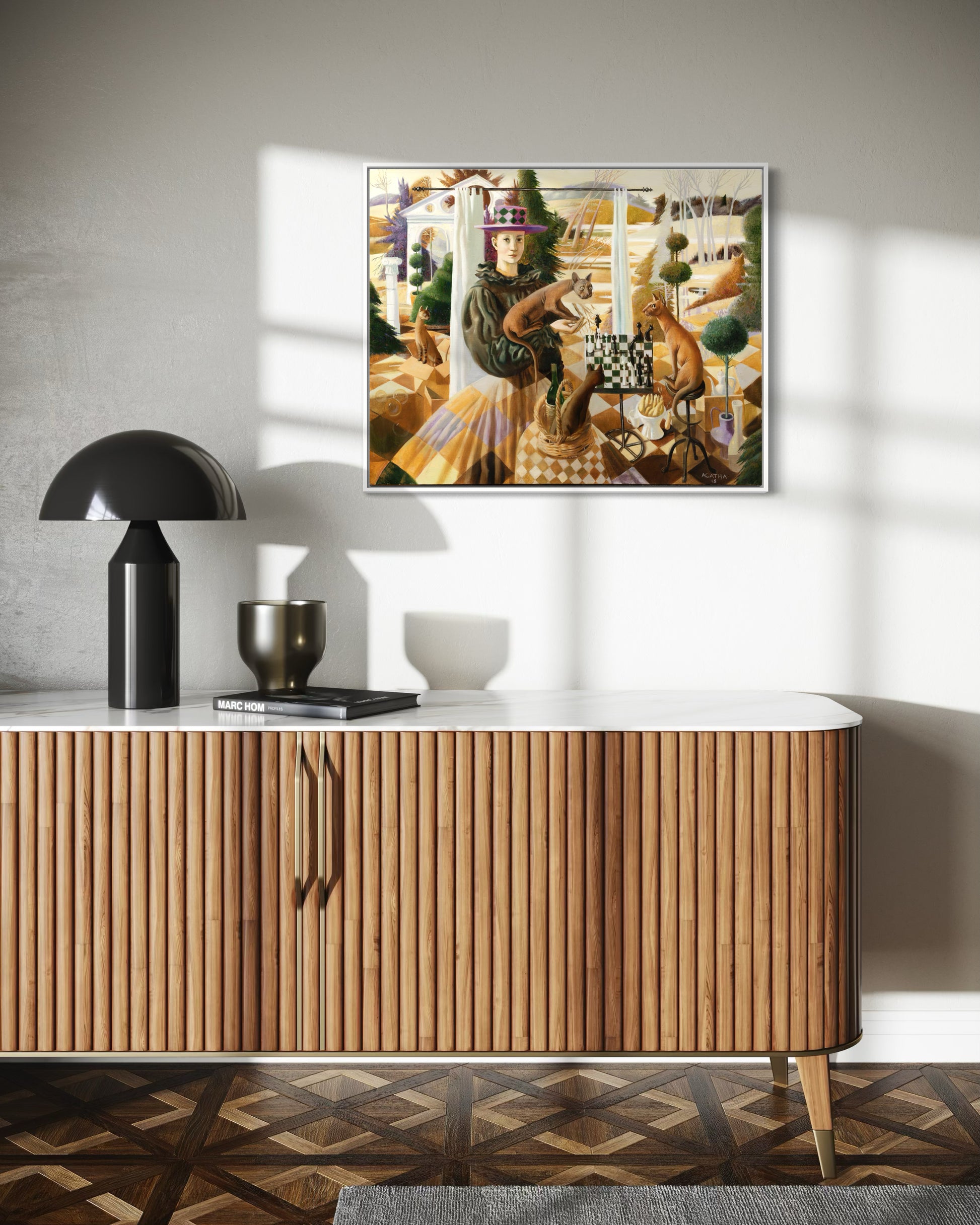 A game is on - but who is really playing? In this strange and dreamy world, cats study the board while the woman stands still, almost part of the puzzle. It is not just chess. It is a quiet mystery wrapped in warm colors, waiting for your move.