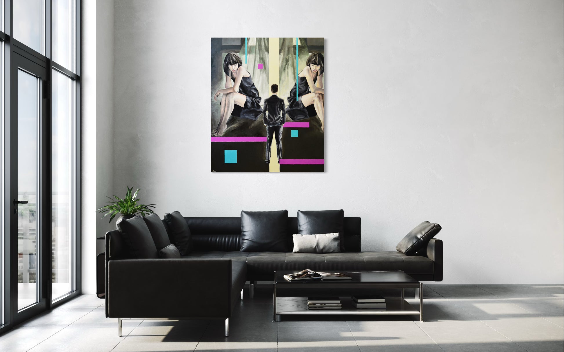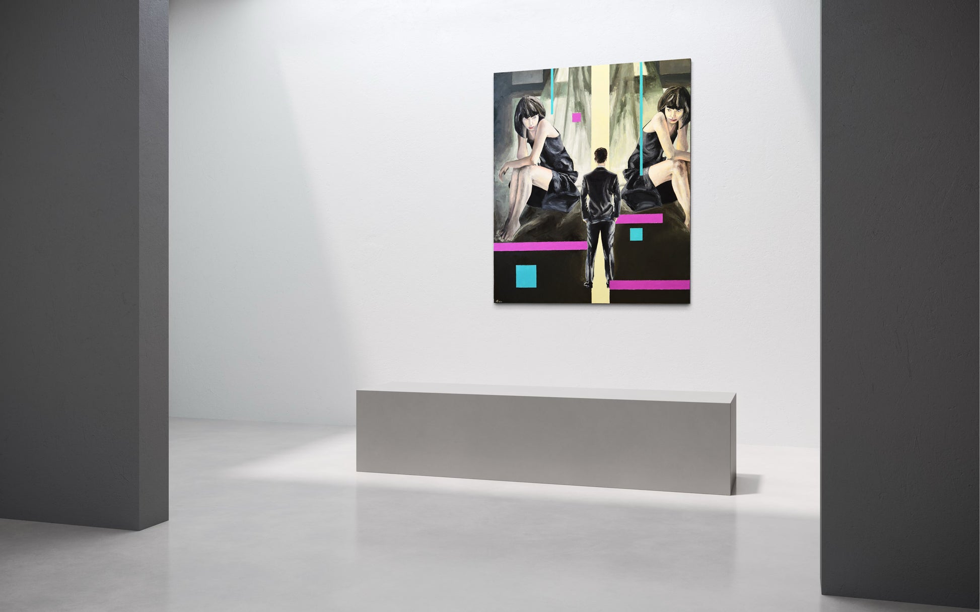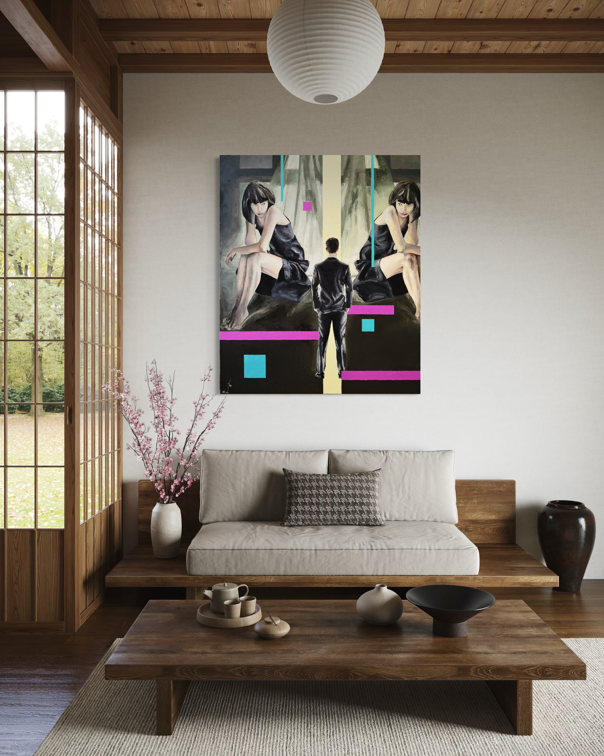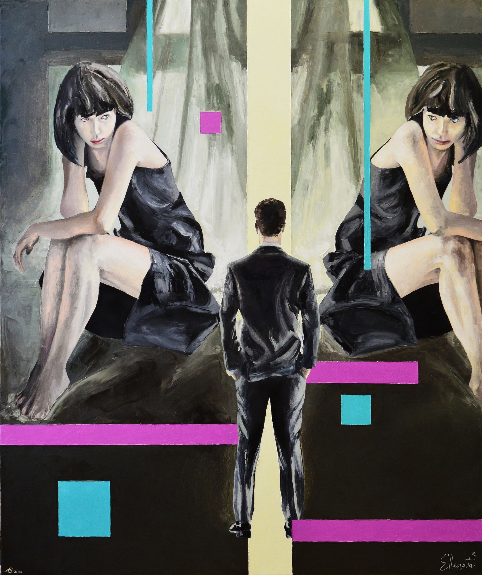 Two versions of her, both silent and waiting. He stands in between, not knowing if the choice is his, or if it was made long ago.
