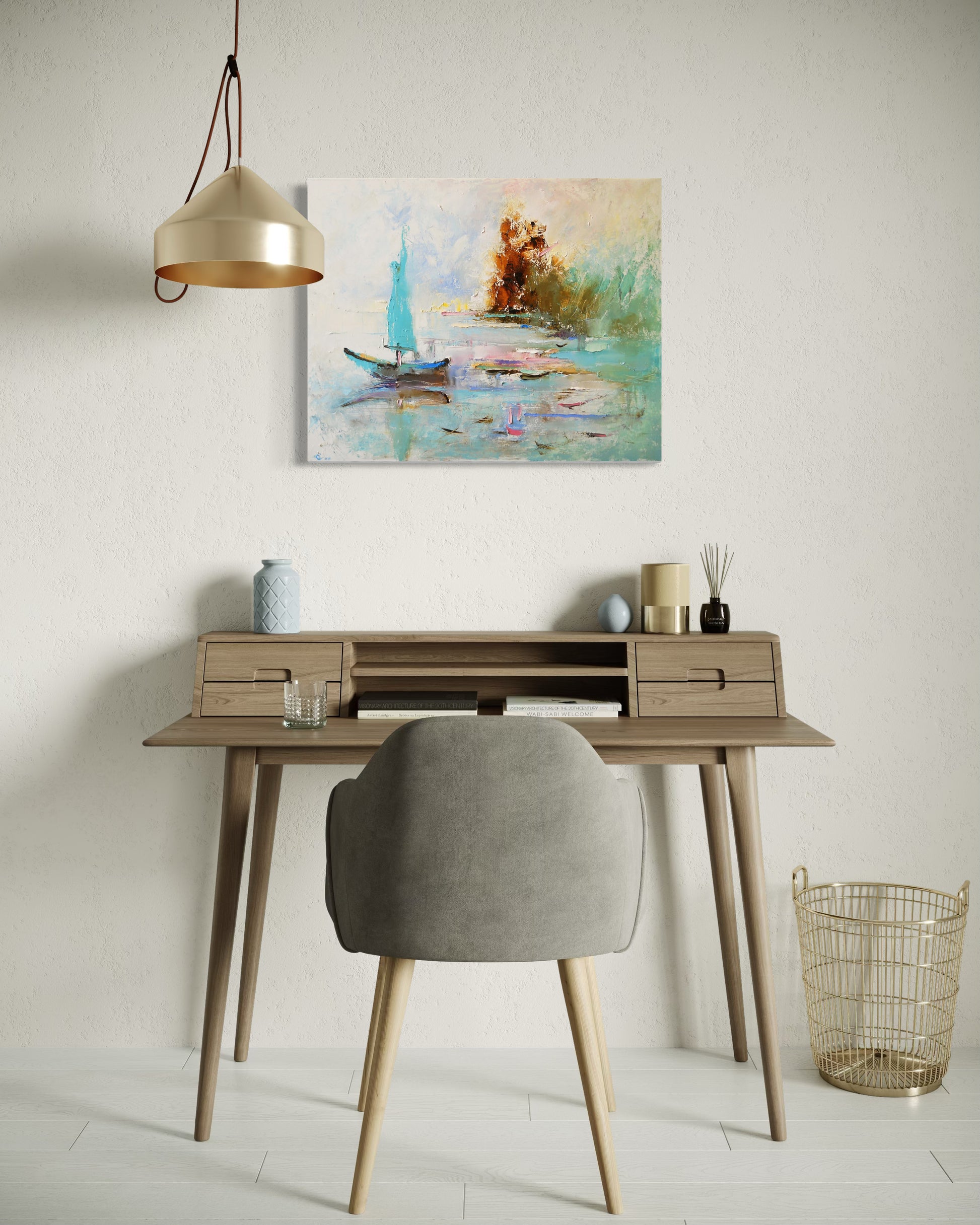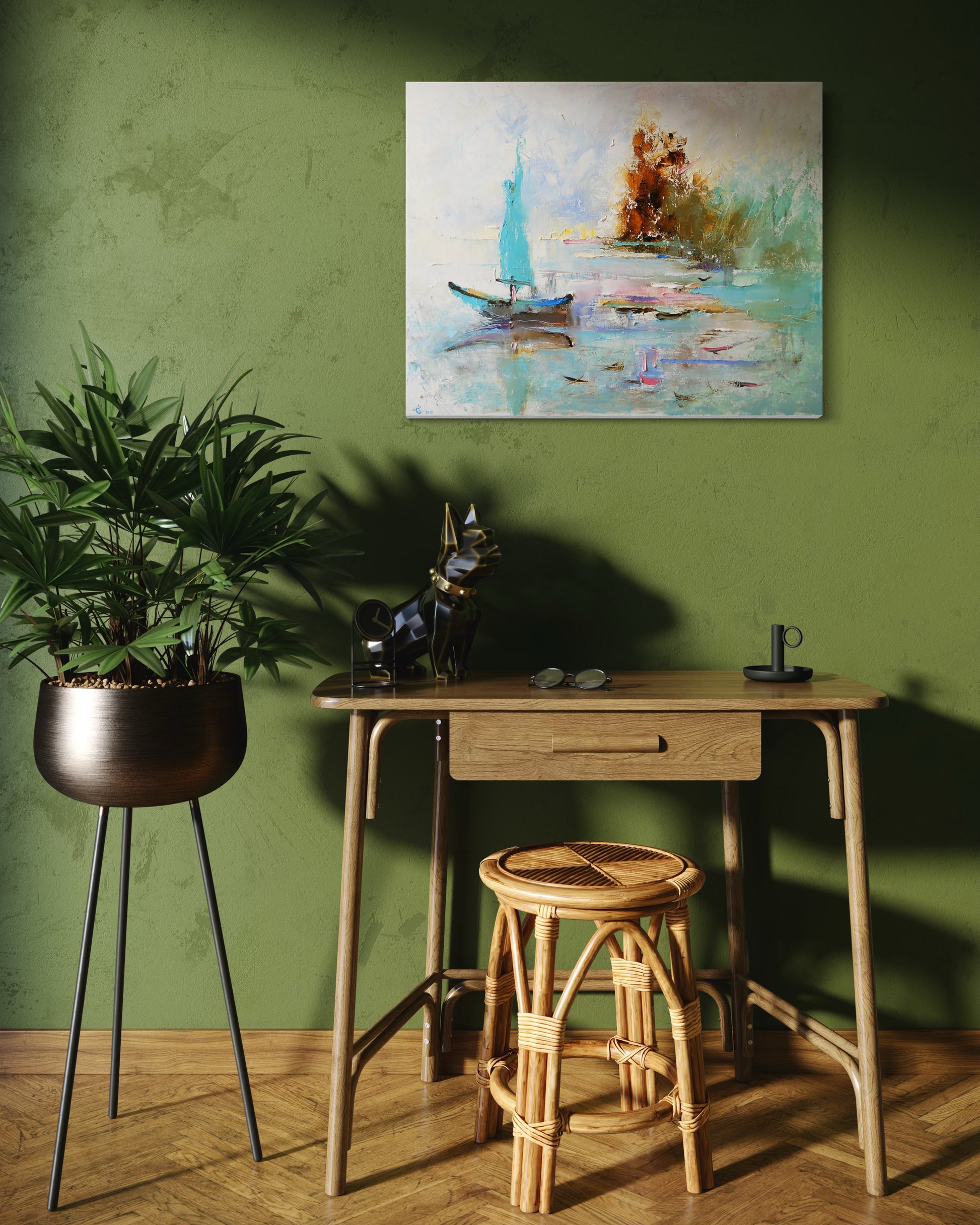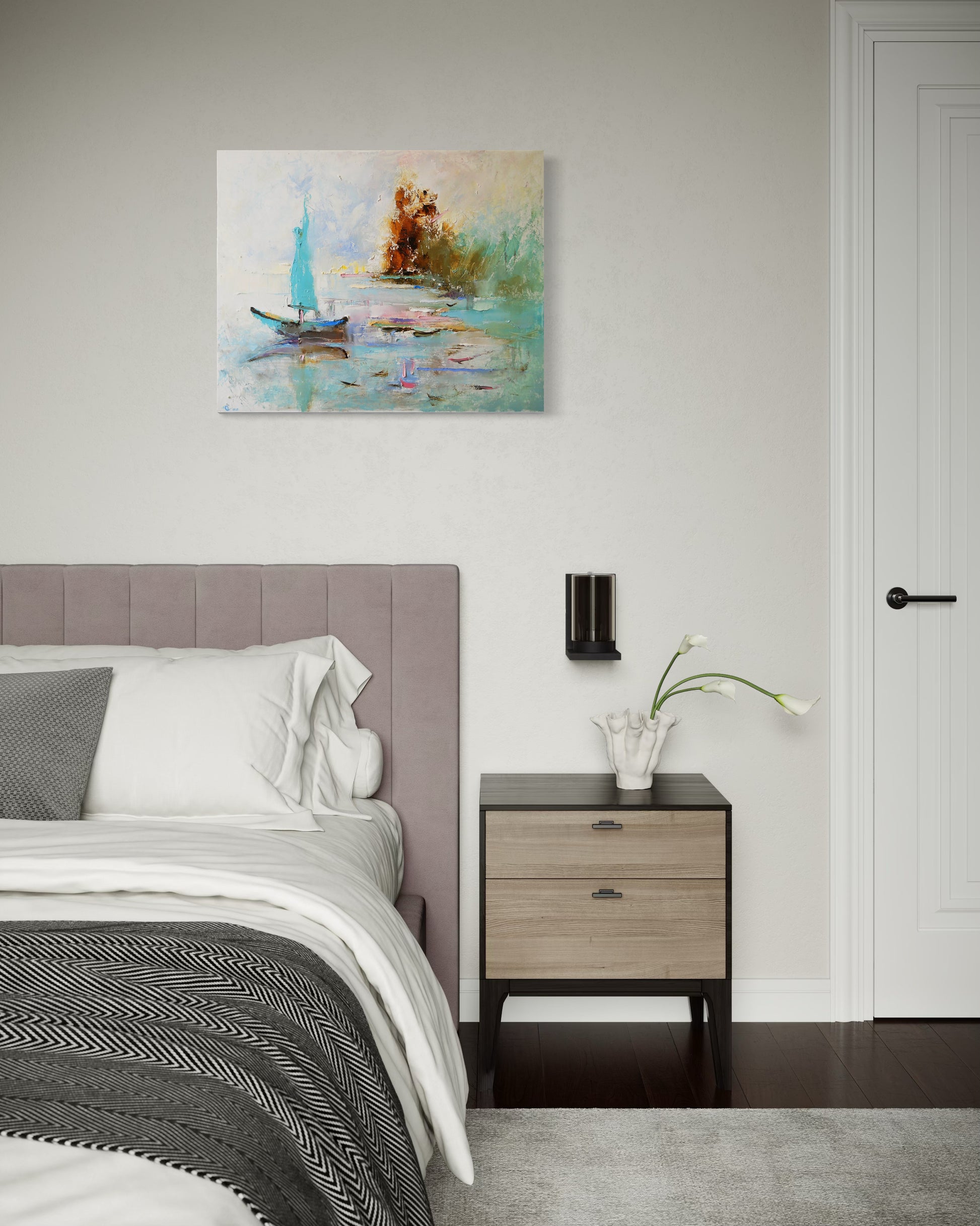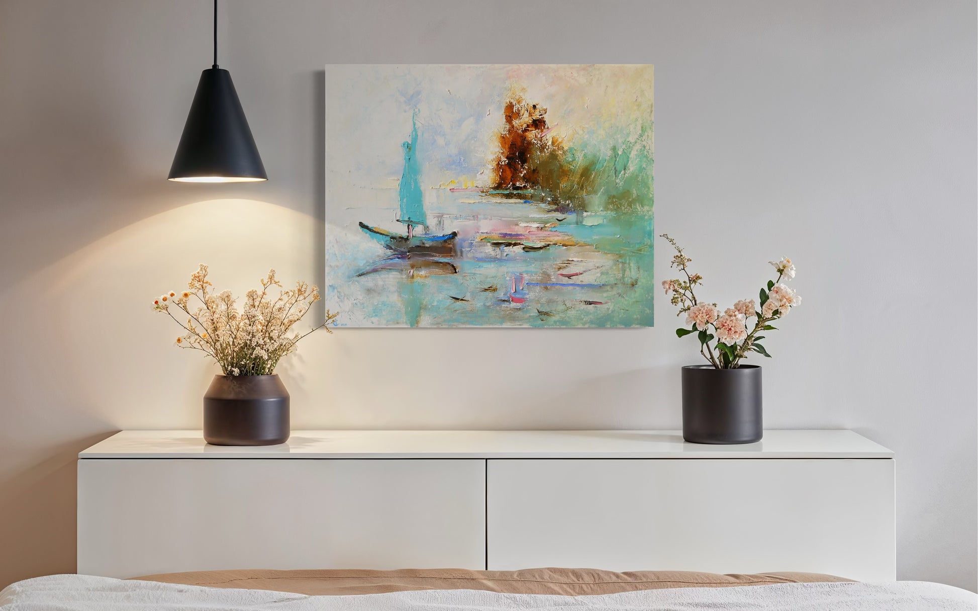 A lone sail drifts through soft colors and memory. The sea is not loud here-it whispers, like a dream half-remembered at dawn, where every ripple holds a secret and the horizon never ends.