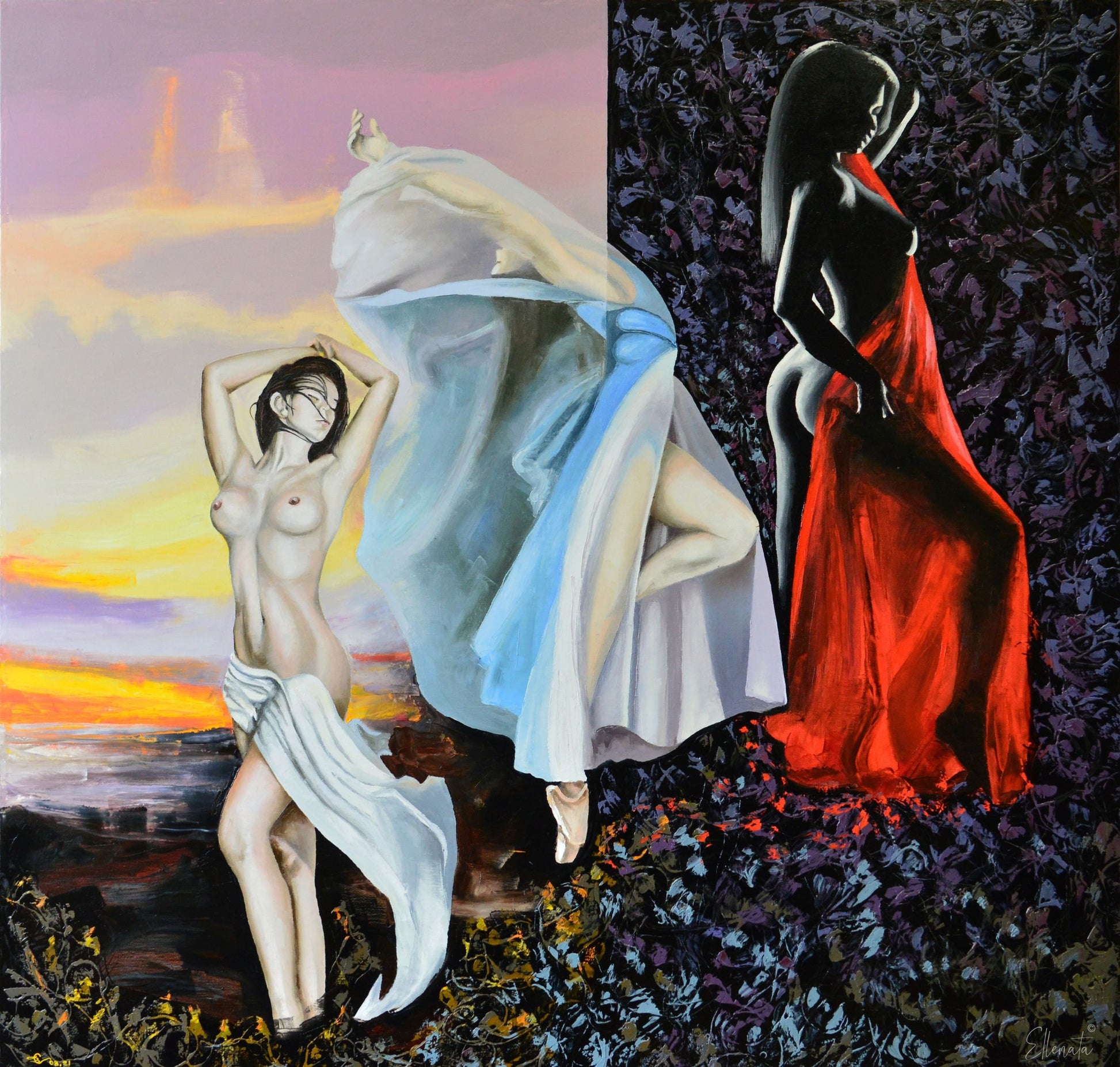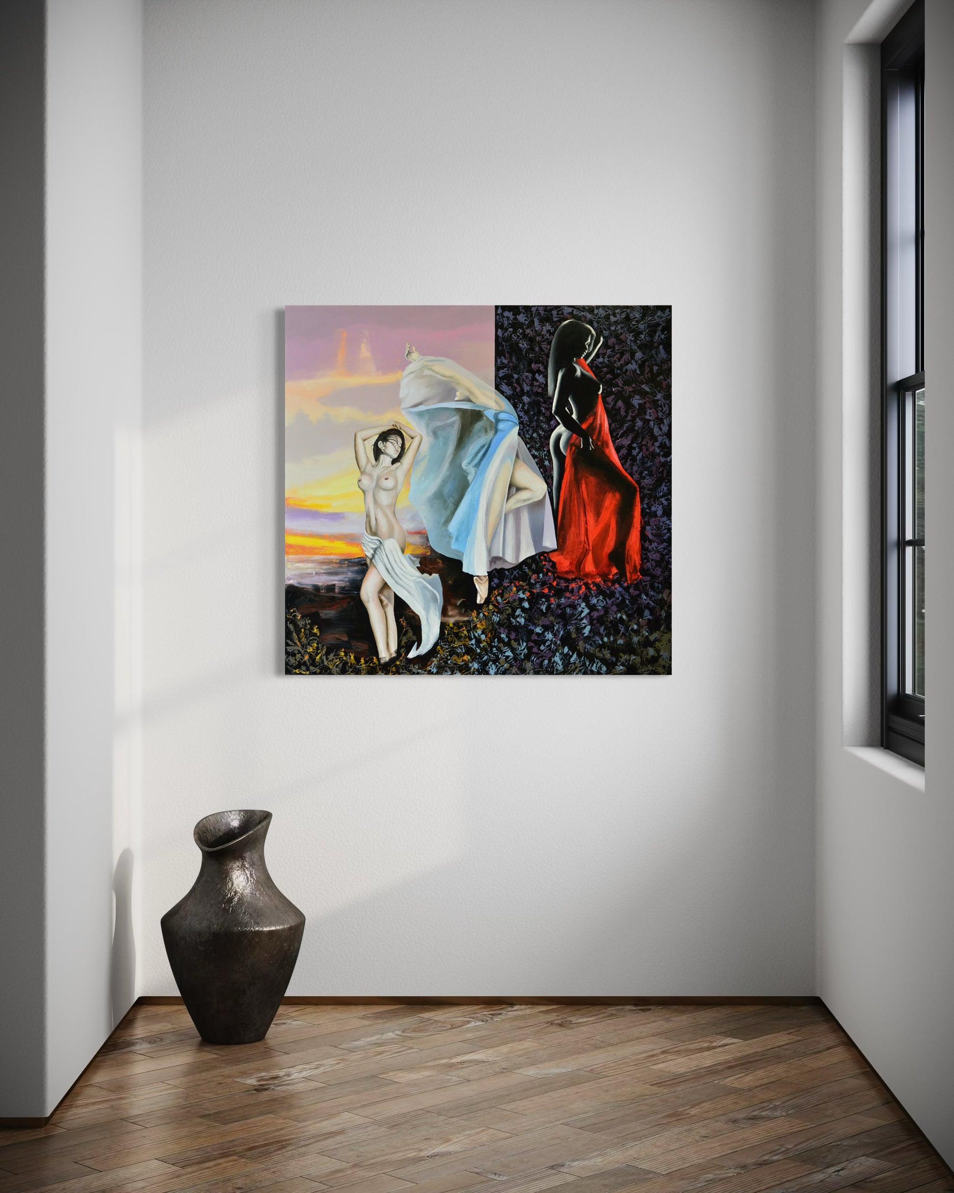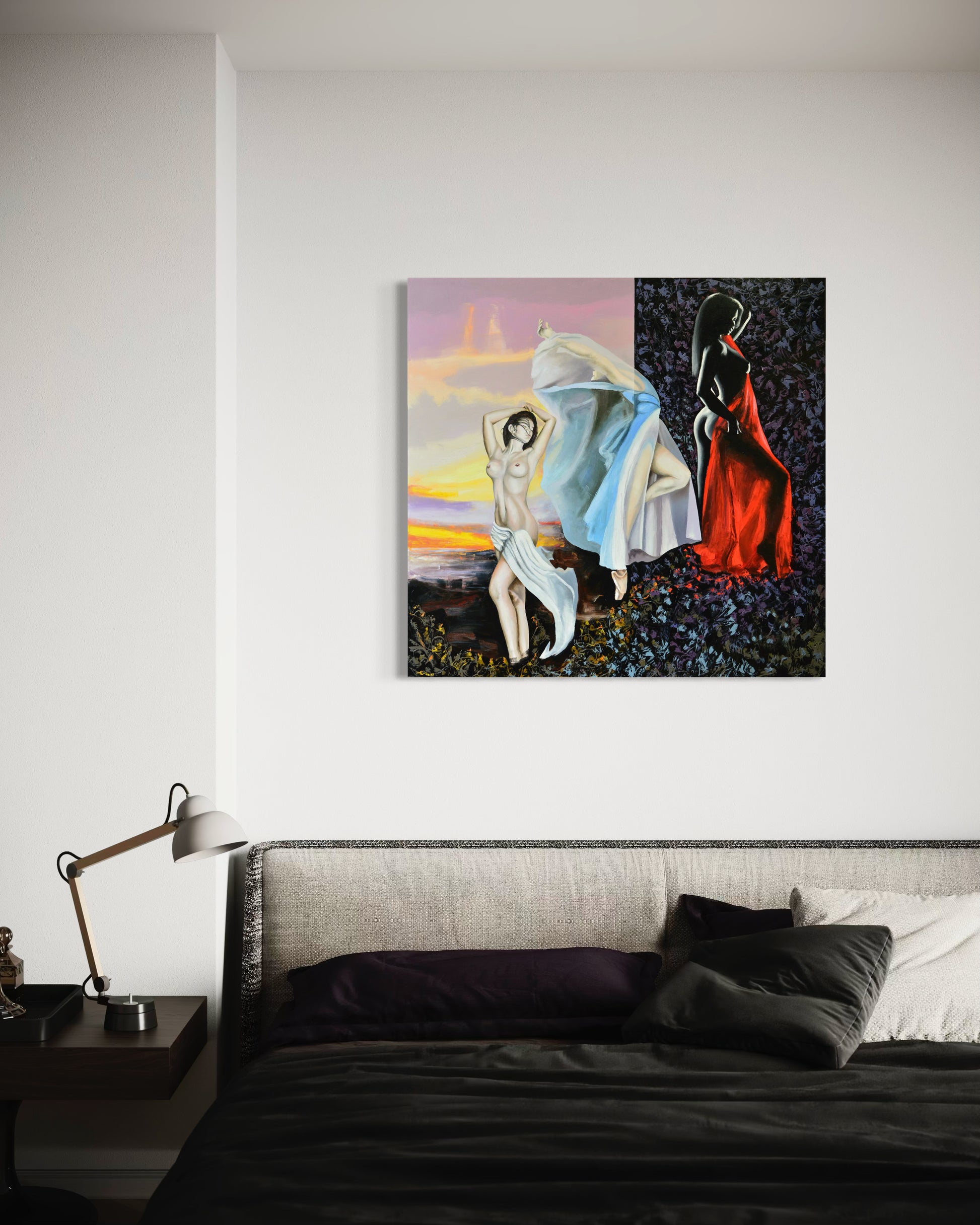 As if caught between the hush of dusk and the curtain of night, they move—one with the golden sun, one with the breath of silk, and one cloaked in a red farewell. Together they form a ballet of eras, a shifting tribute to vanishing ideals. The stage is soft, but the exit—undeniably bold.