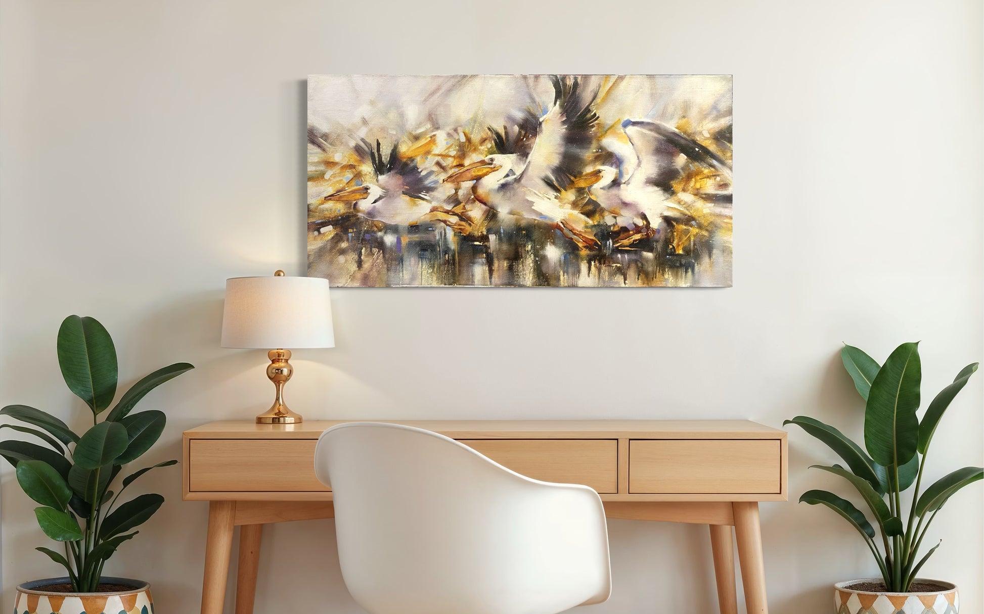 Wings beat the water in a blur of motion as light spills over feathers and reeds. It feels like sunrise and flight all at once- wild, free, and full of shimmering warmth.