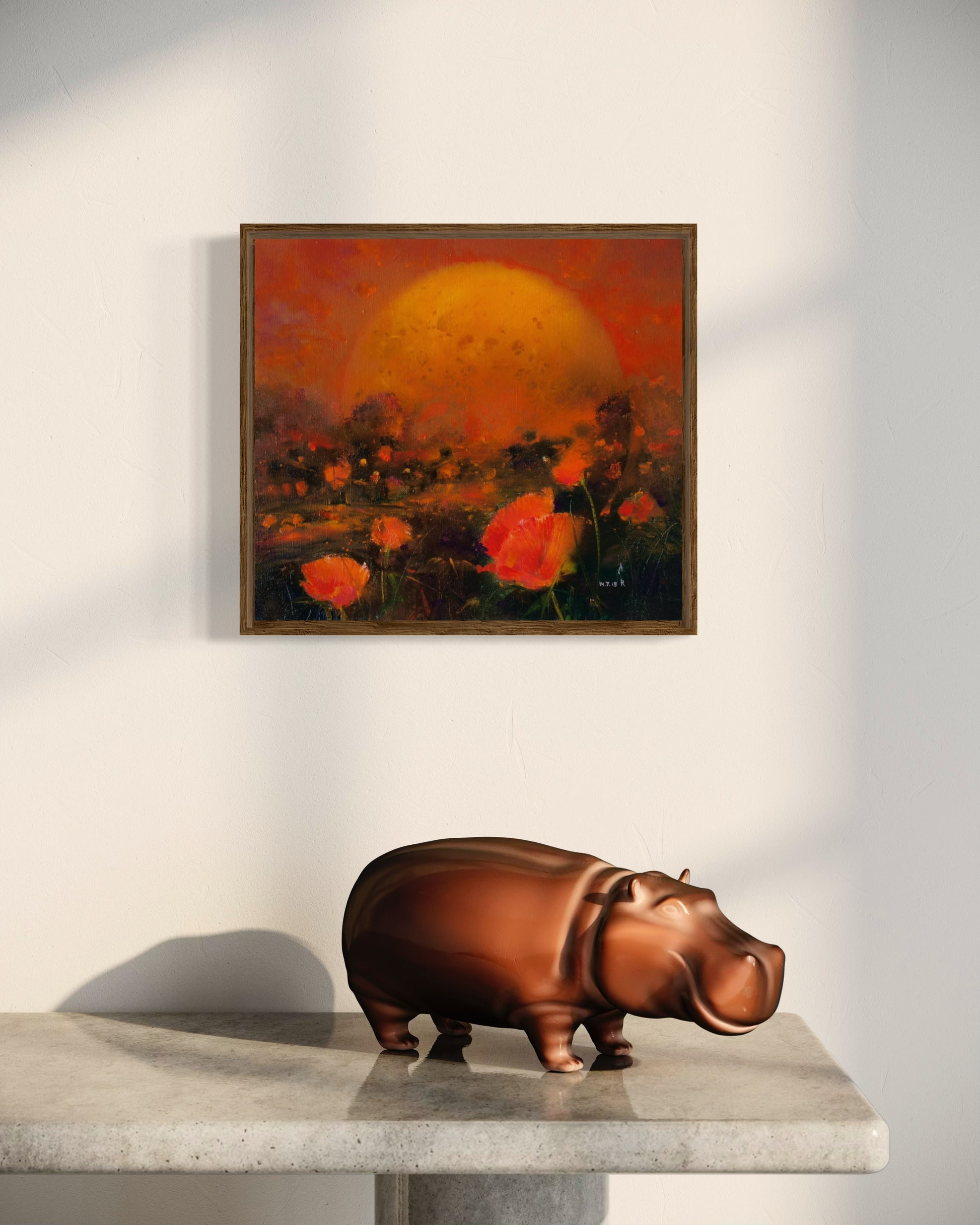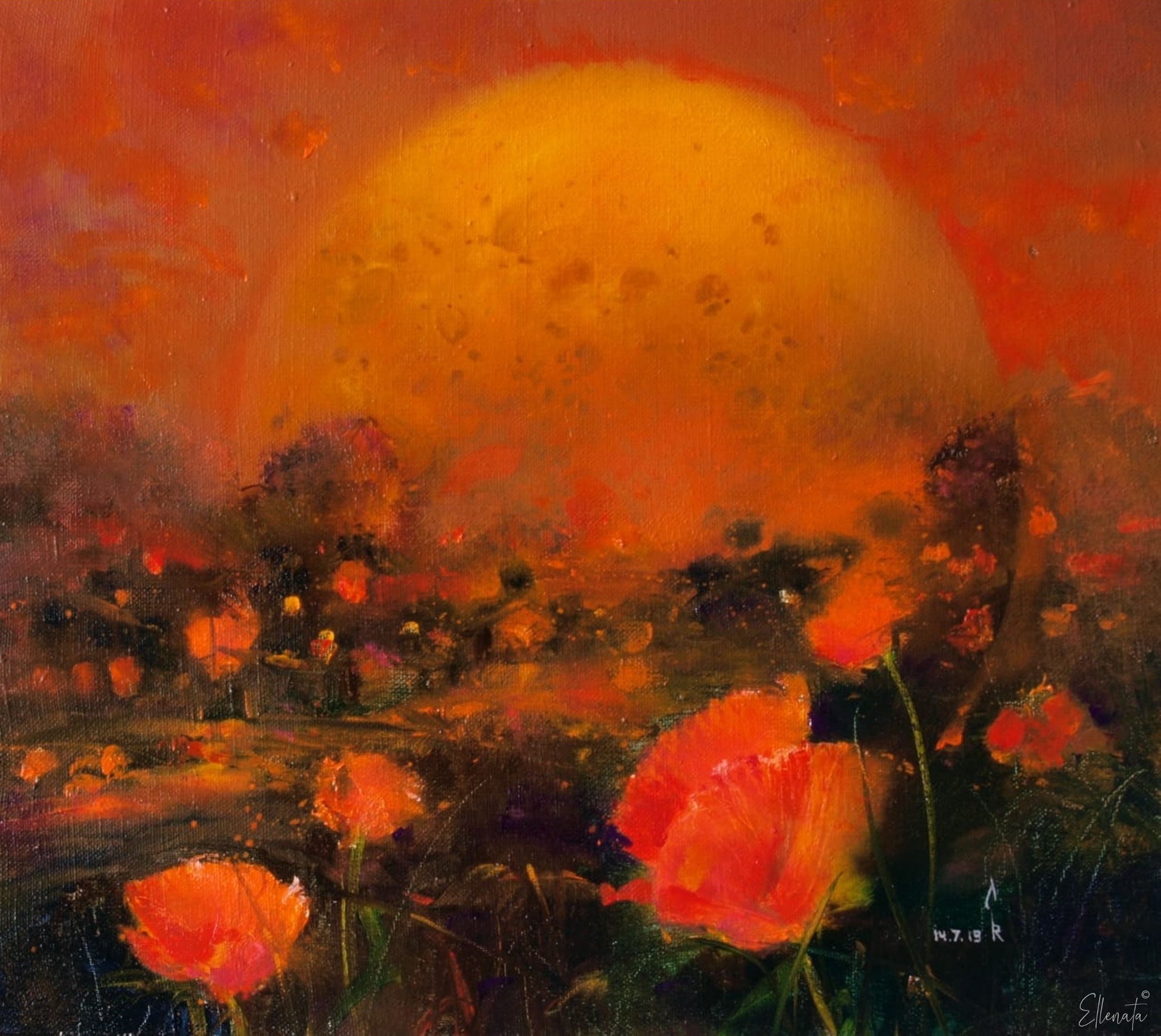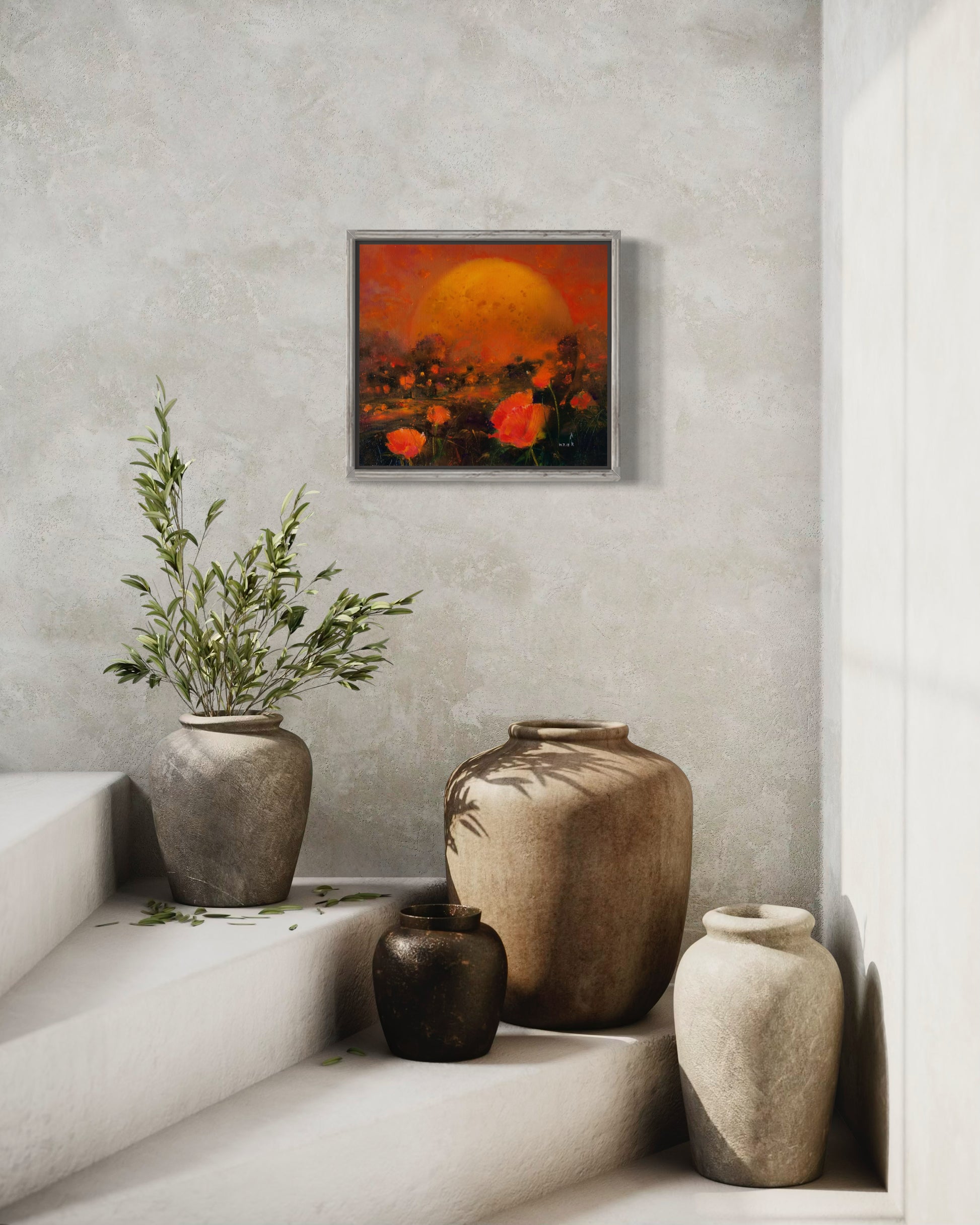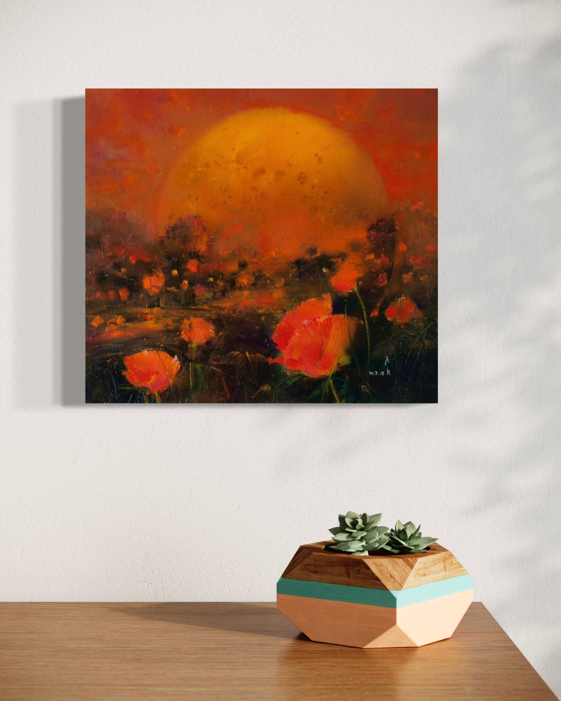 The moon rose like a burning sun, casting warm gold over sleepy houses and blooming poppies, as if the whole town paused to inhale the heat of a dream that never quite ended.
