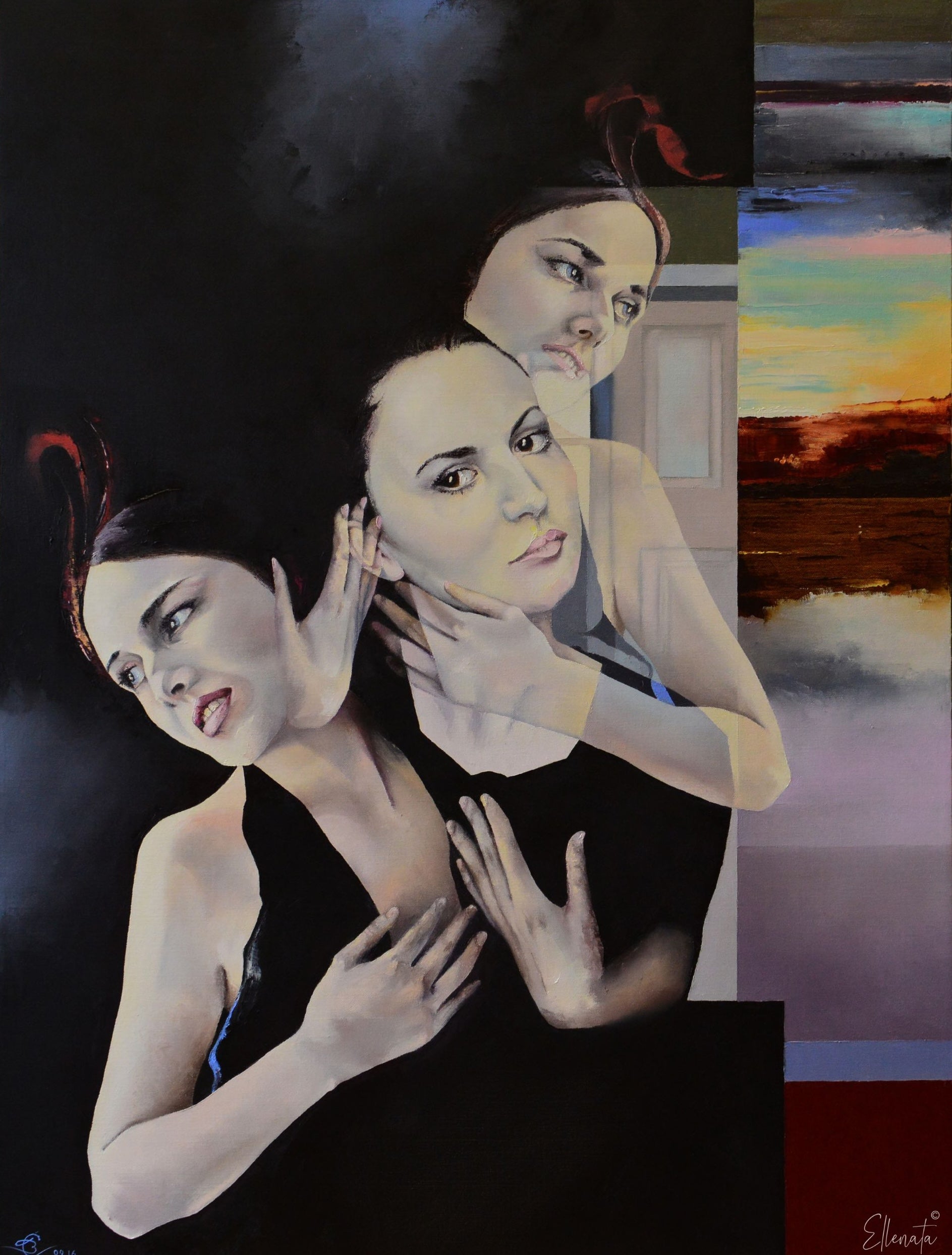 Three versions of the same woman emerge -listening, resisting, reflecting. It’s unclear whether she’s breaking free or folding inward, but each gesture tells a truth only she can hear. Behind her, fragments of a distant world remain just out of reach.