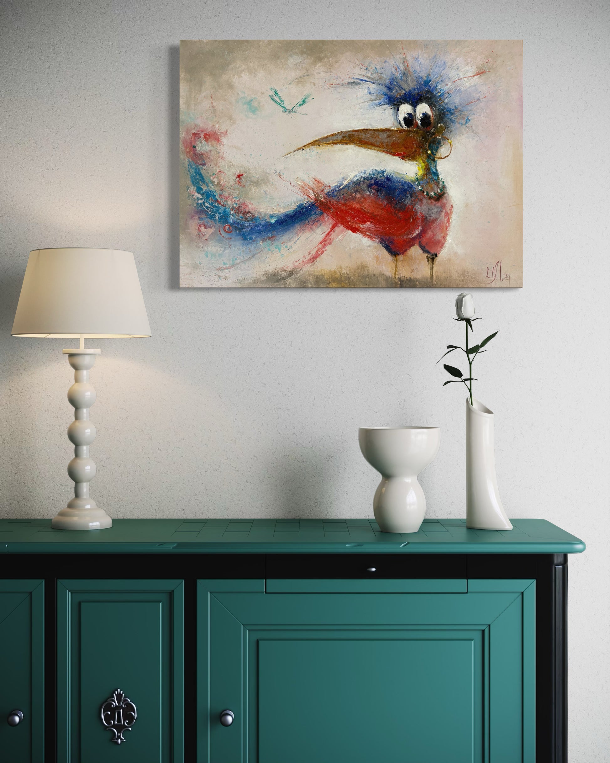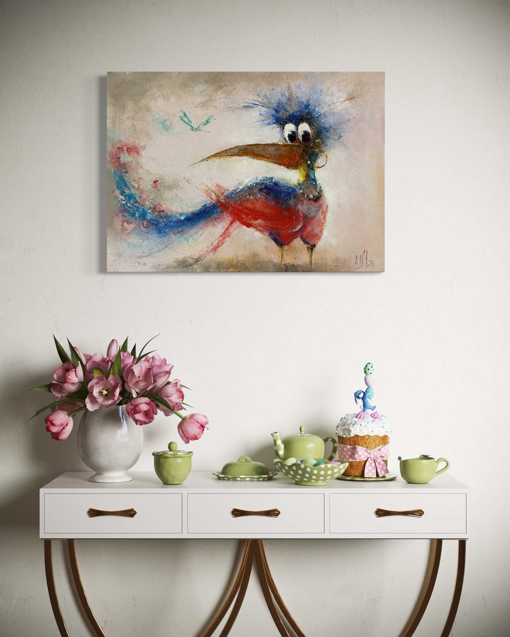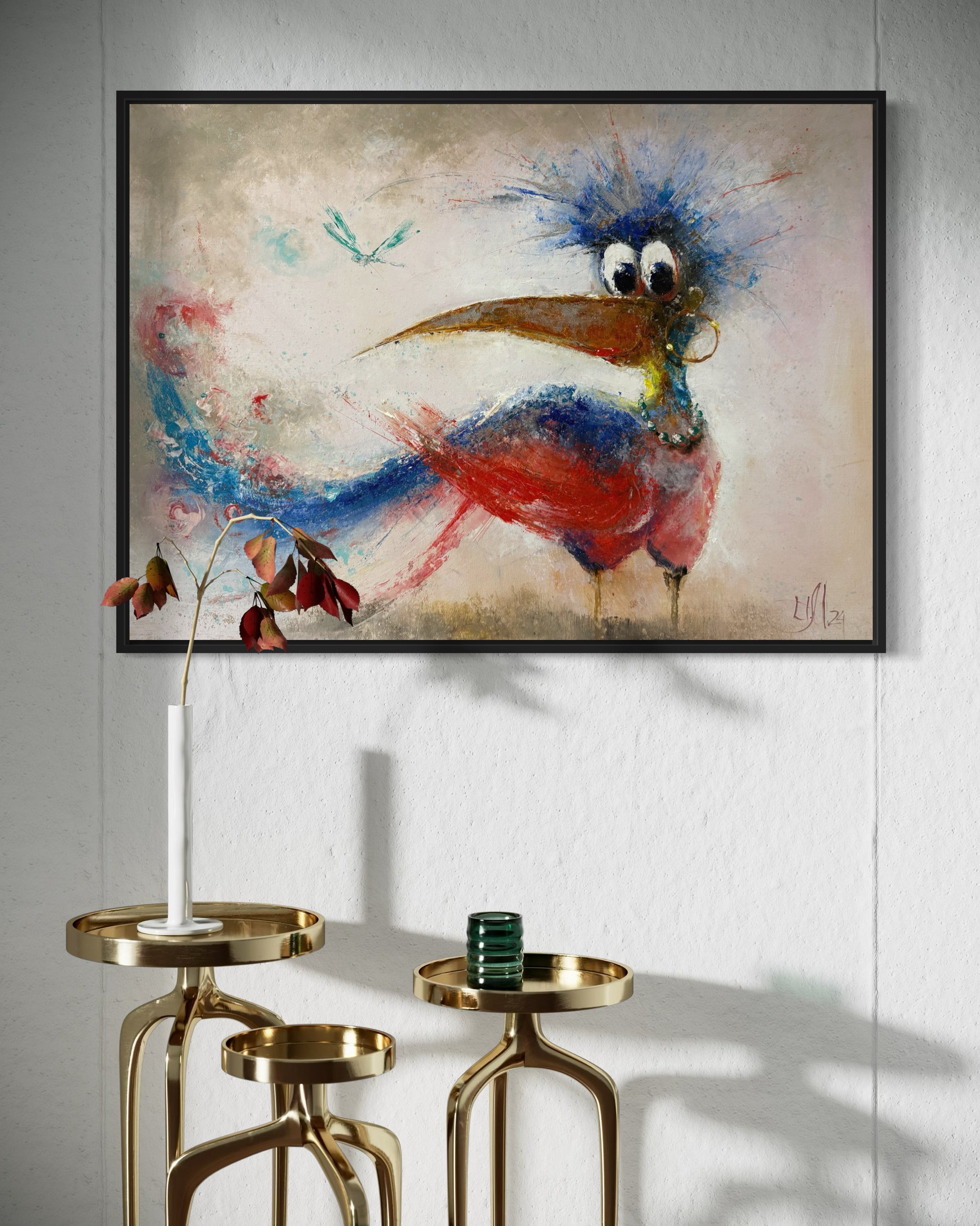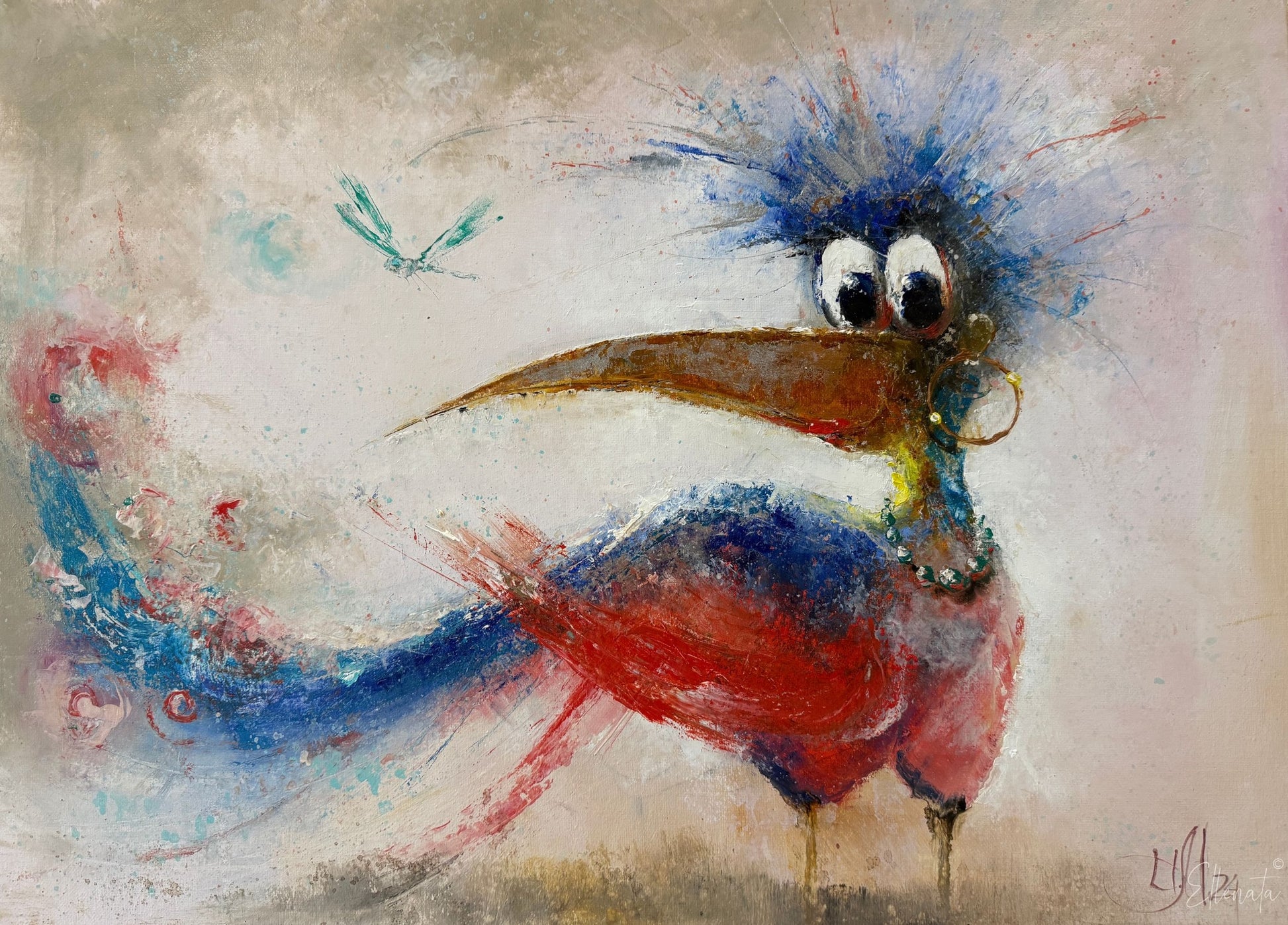 Madame Beakley, the big, beautiful bird, has an interesting style consisting of hoop earrings and a pearl necklace matching her golden, large beak. She stands tall watching male birds fight over her.