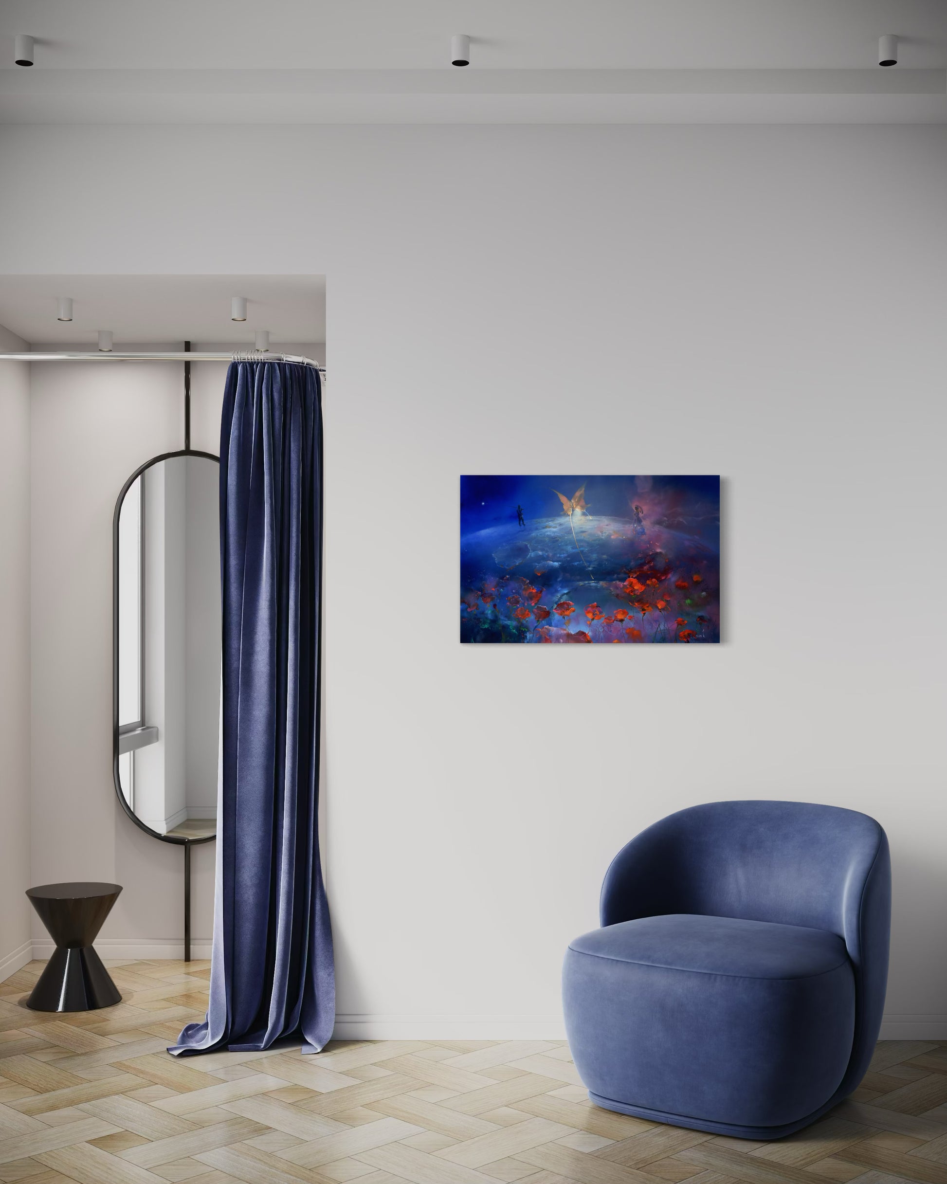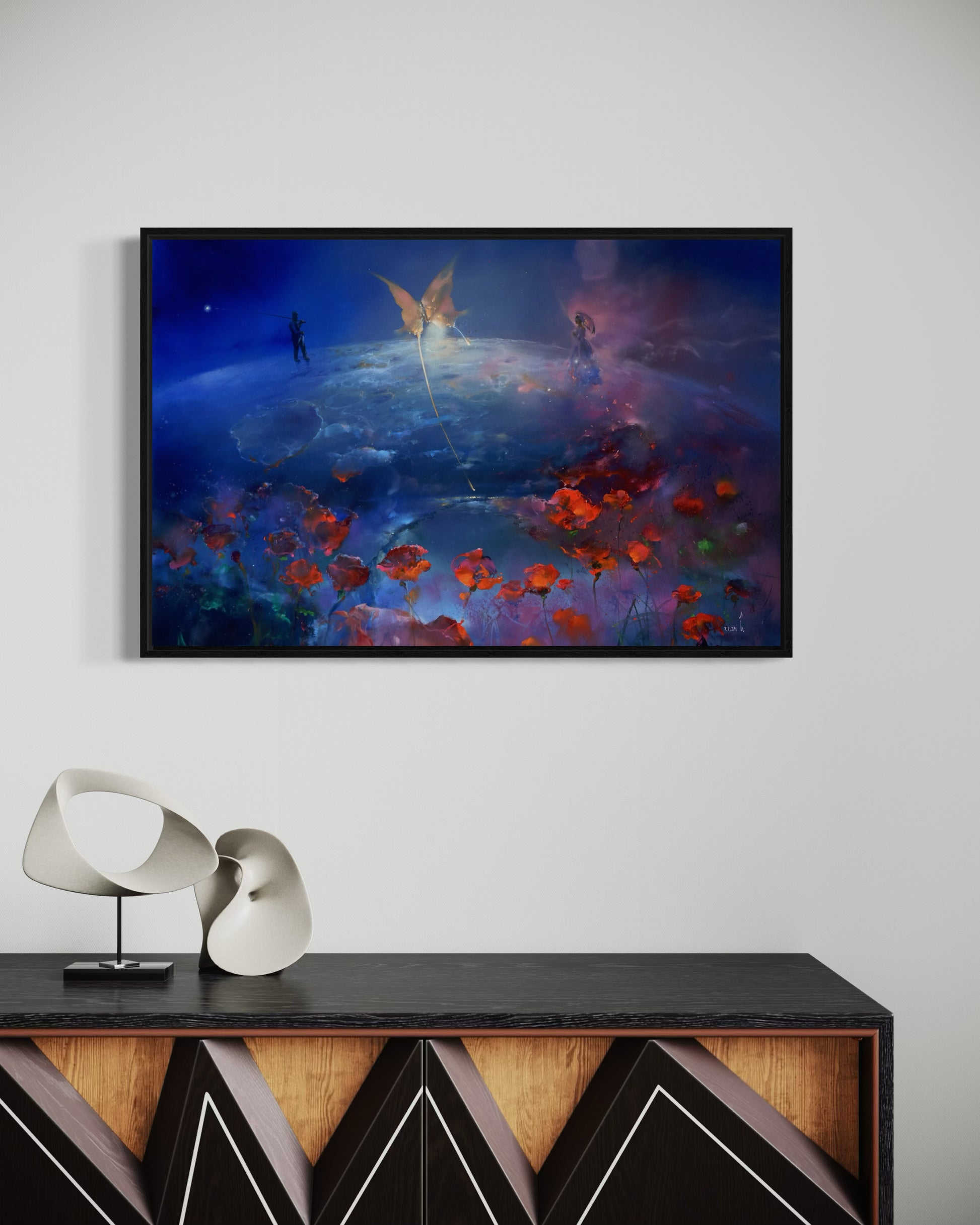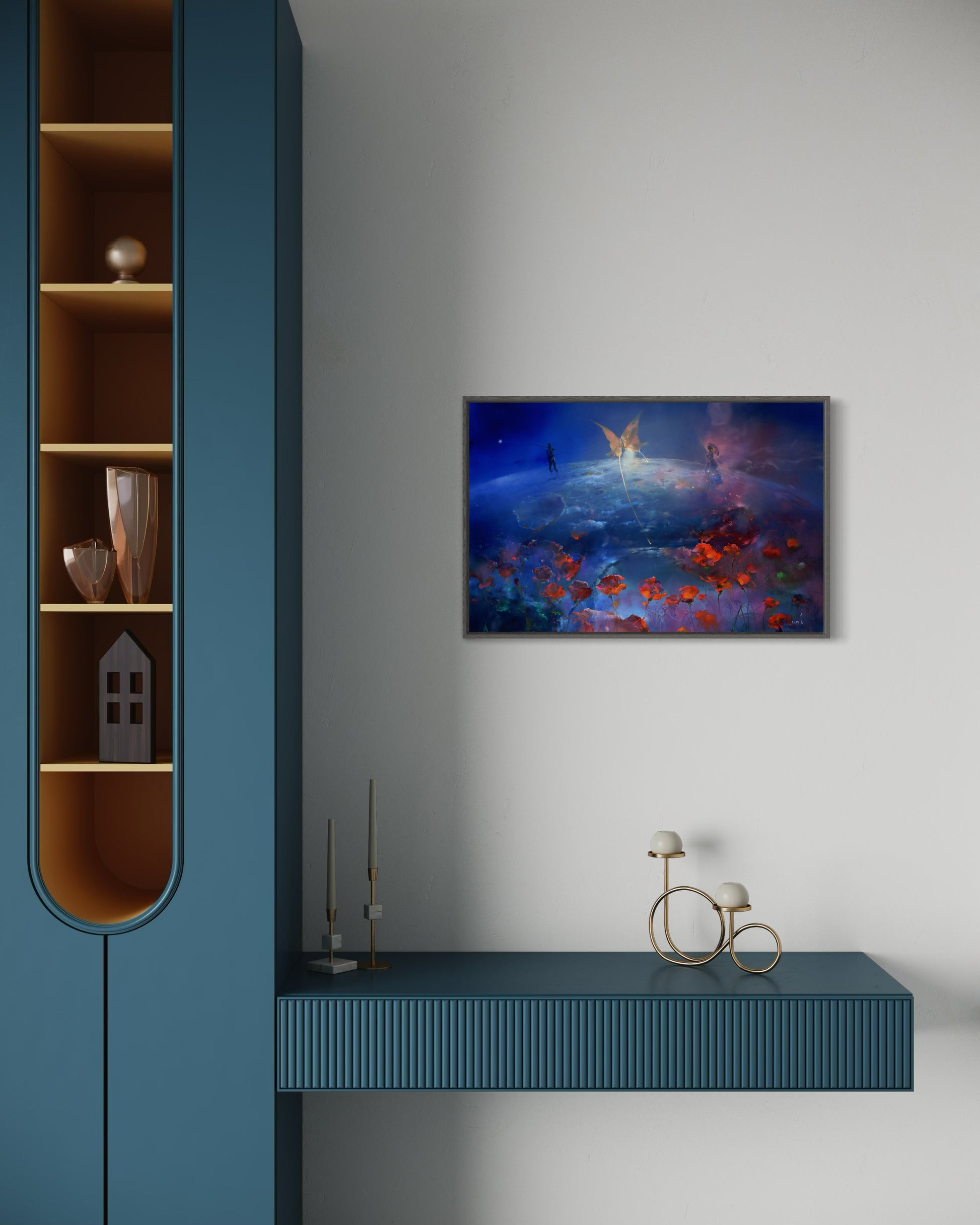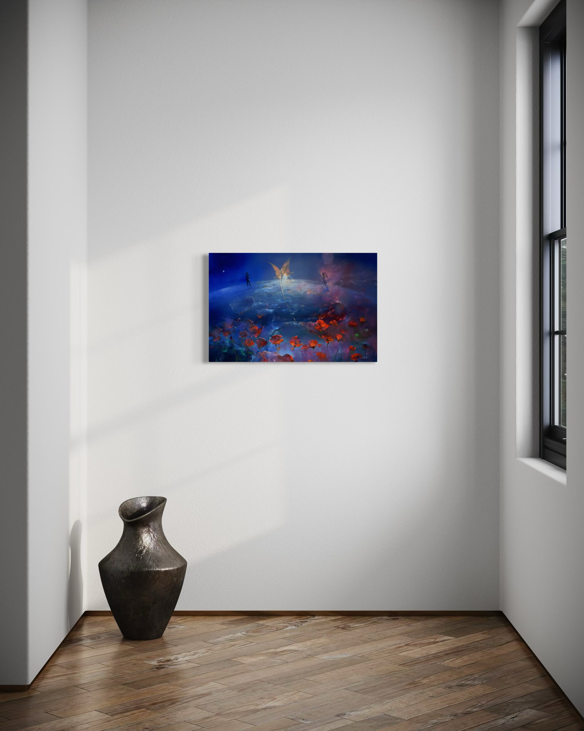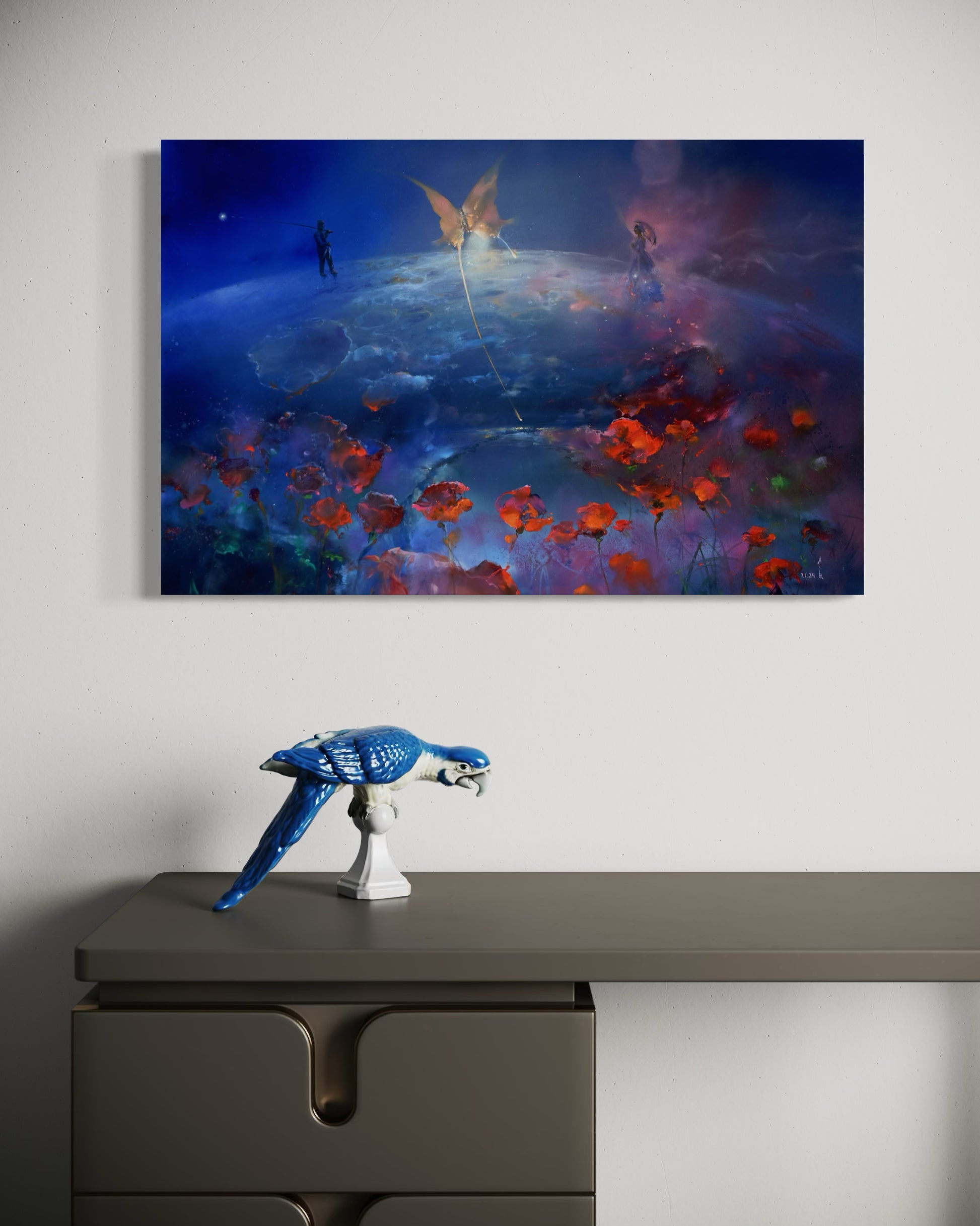 Two sides of an old dream meet on the quiet moon, connected by a kite made of light. Below, poppies shift, but not from wind, from memory, as if they still feel the echo of someone who once danced across the stars.
