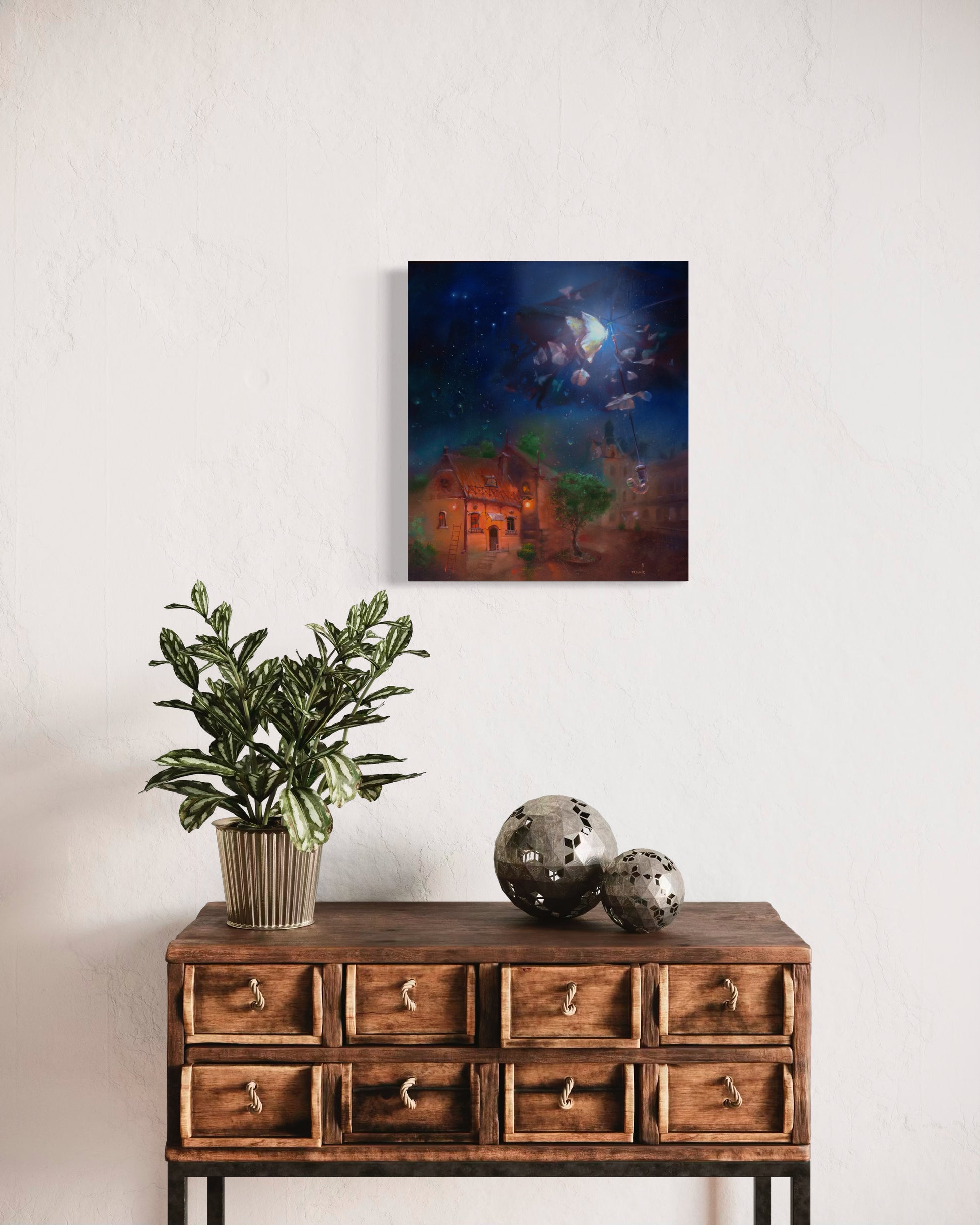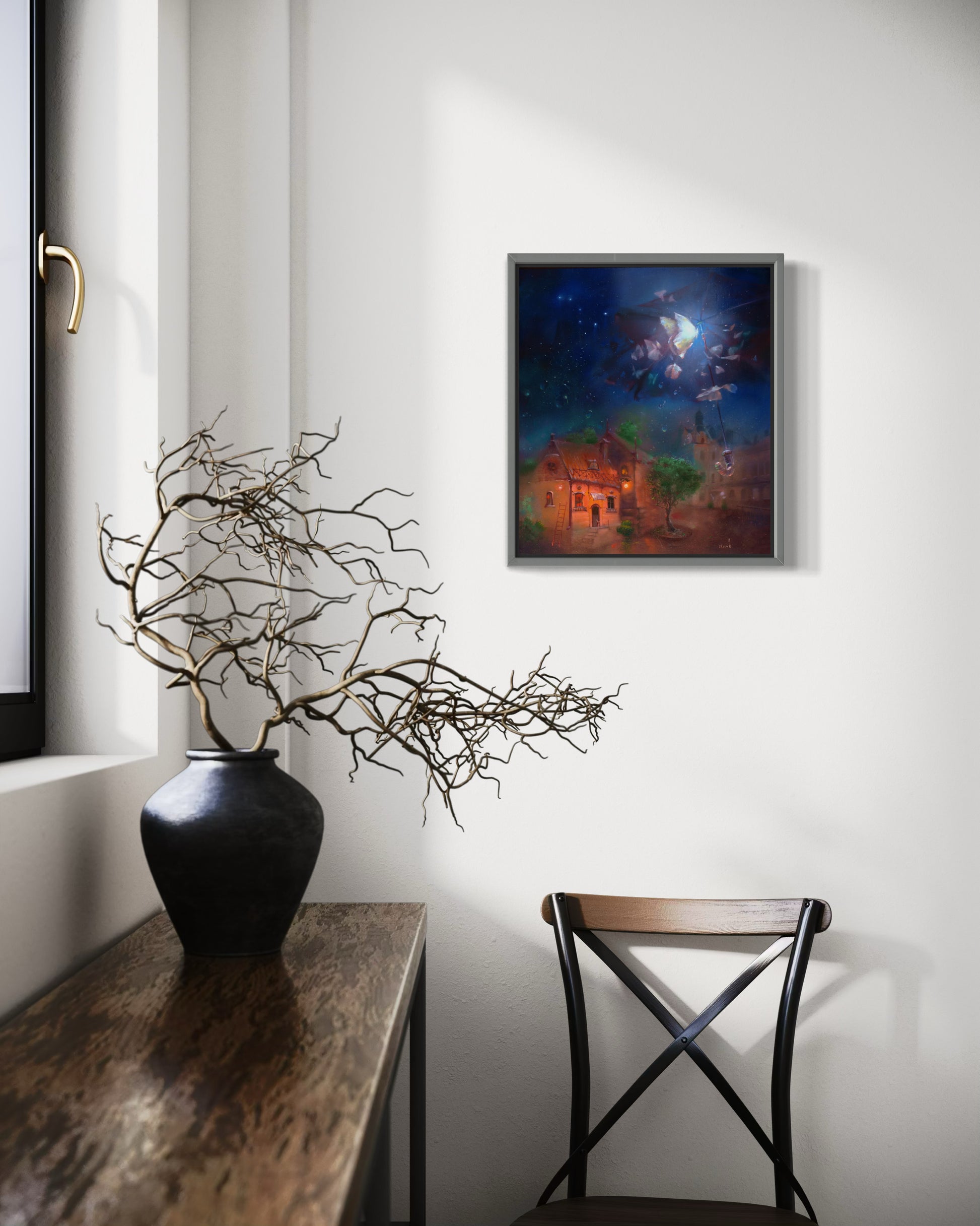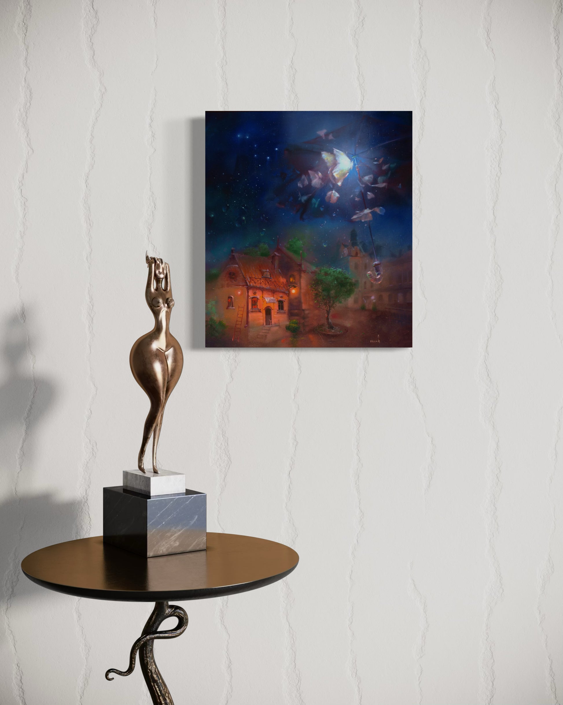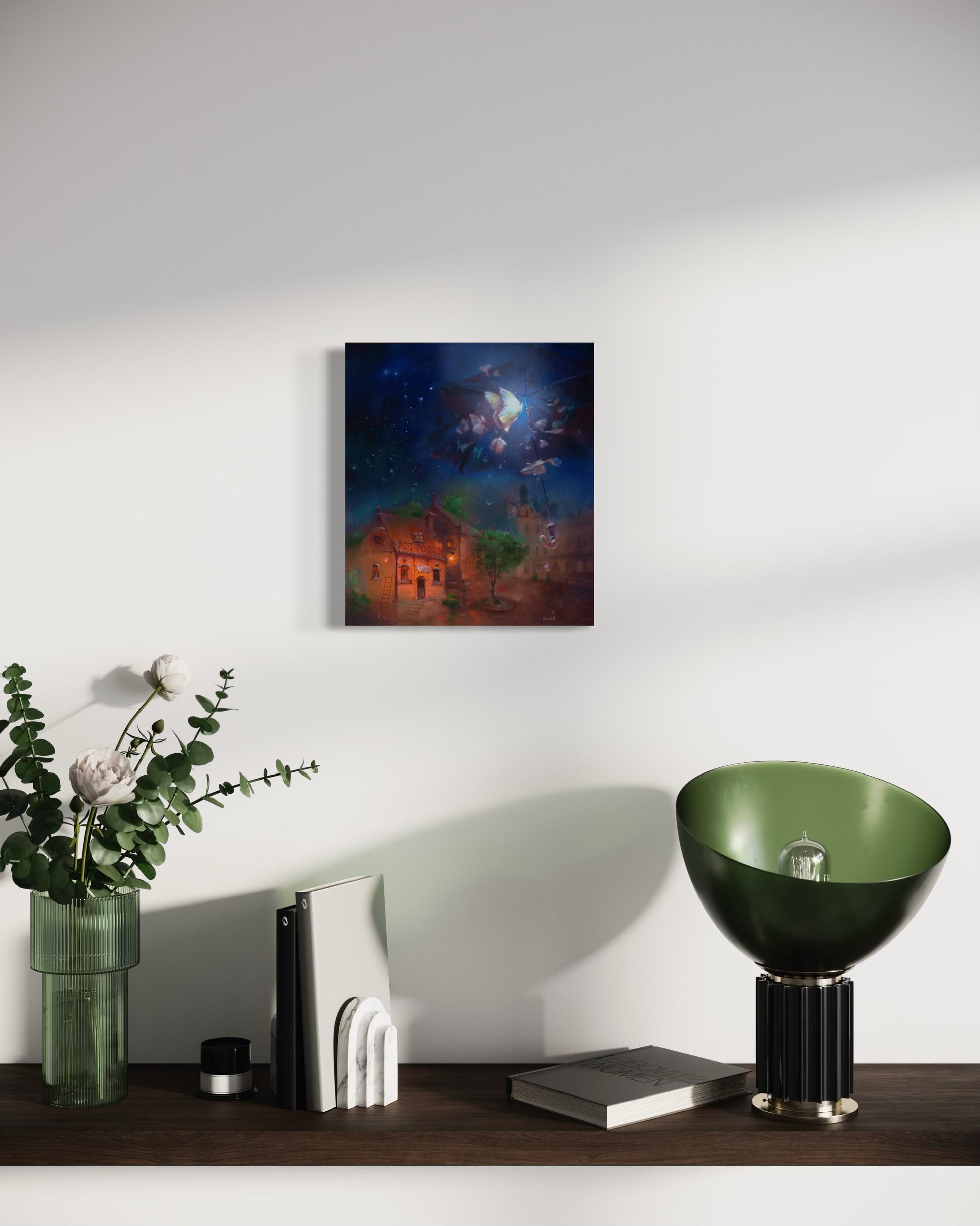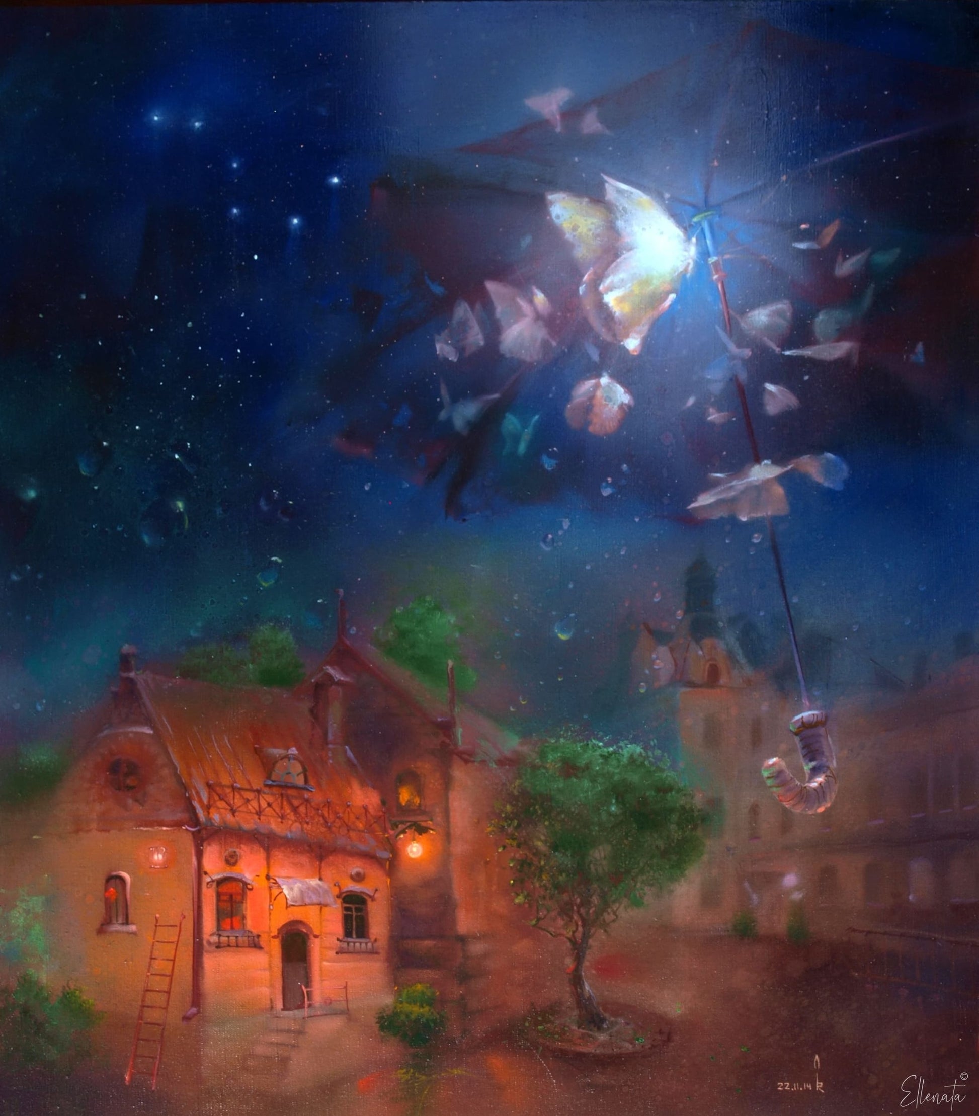 An umbrella left open in the night sky catches not rain, but moths and stars. Below, the old house glows gently, as if still waiting for someone to return. The air hums with memories too soft to speak aloud, drifting through warm windows and quiet trees.
