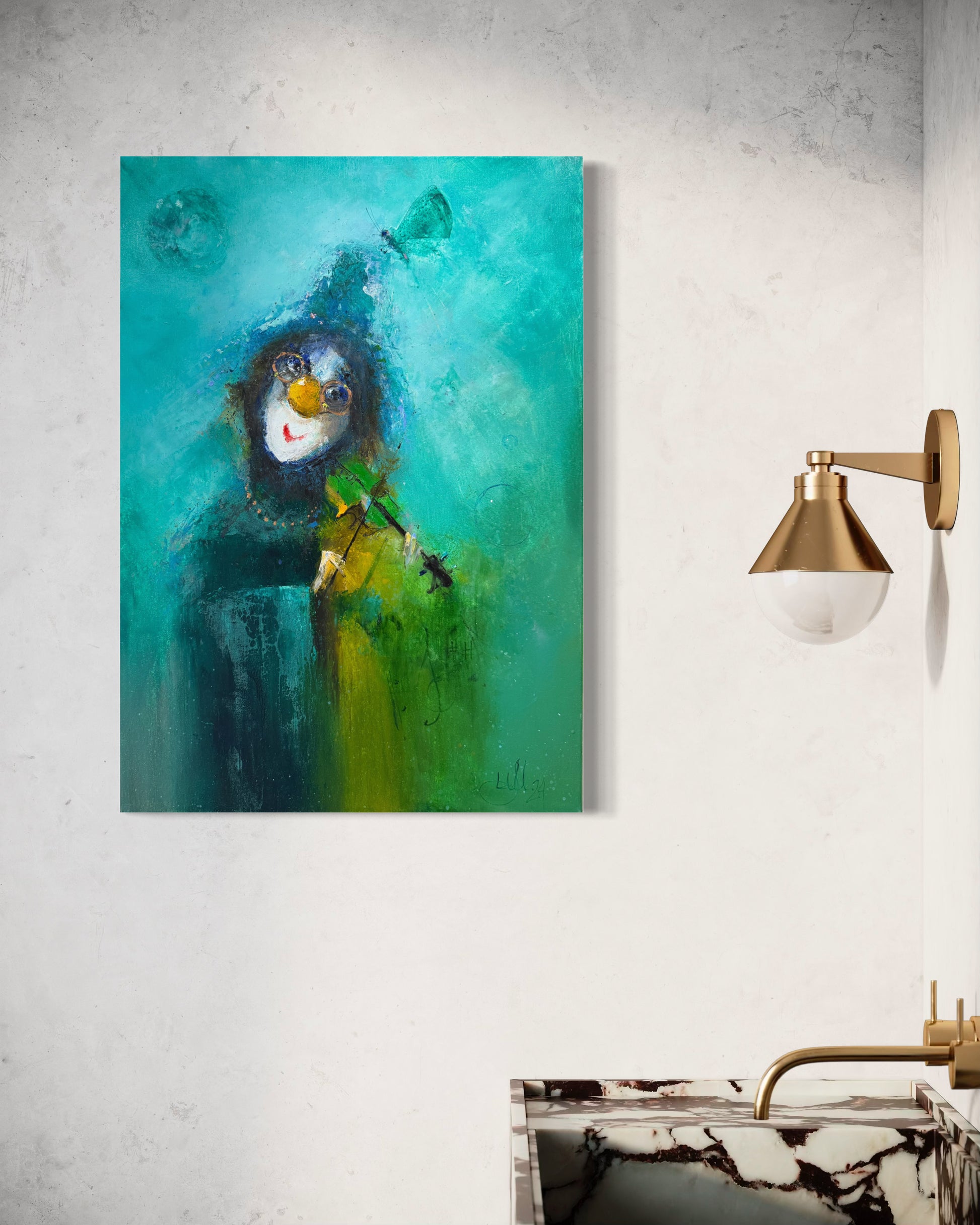 A musician with a yellow nose and rose-tinted glasses plays his violin in a teal sky. His only audience is the butterfly on his hoodie... and maybe the moon. Nobody is sure if the tune is real, but the vibe? Impeccable.