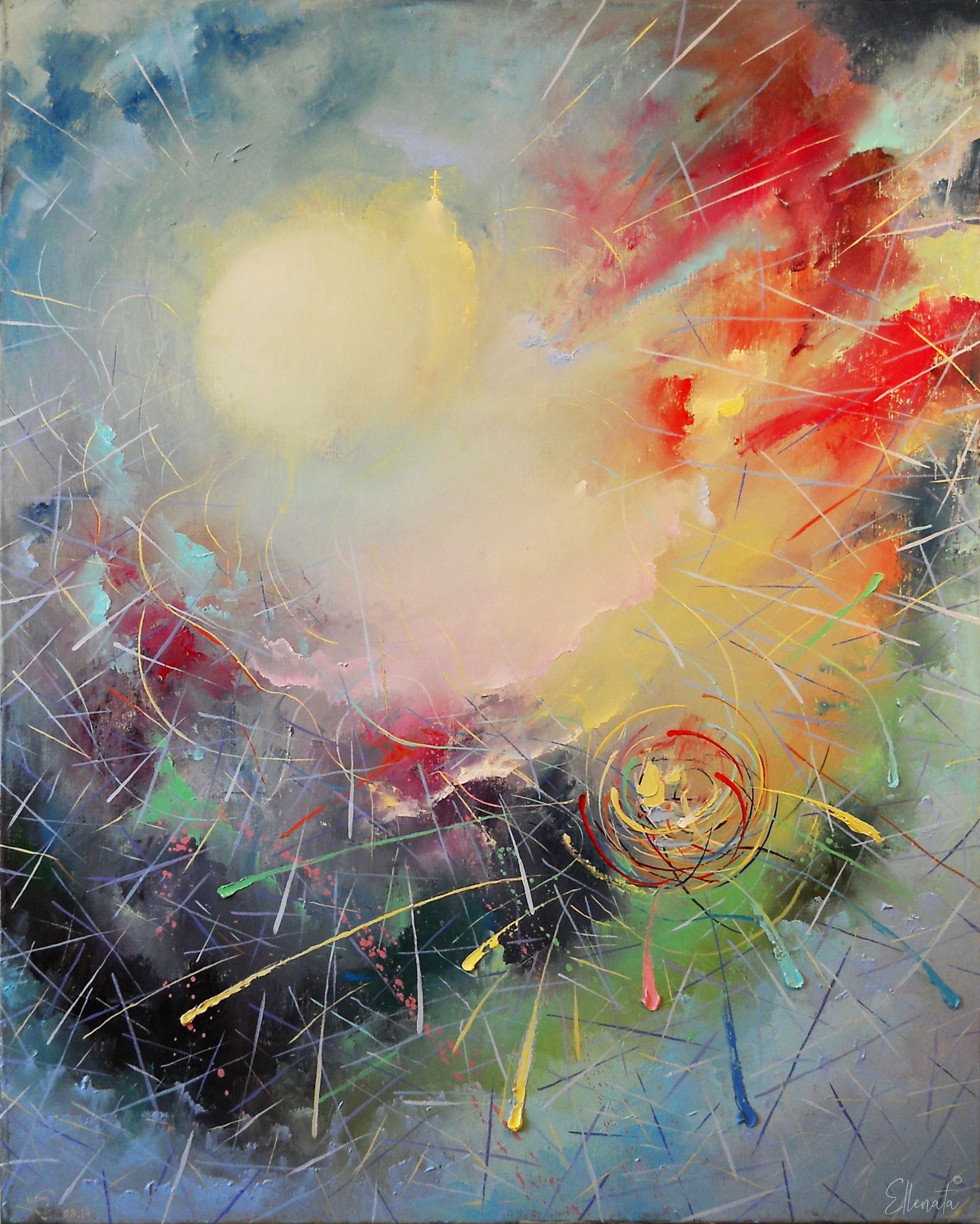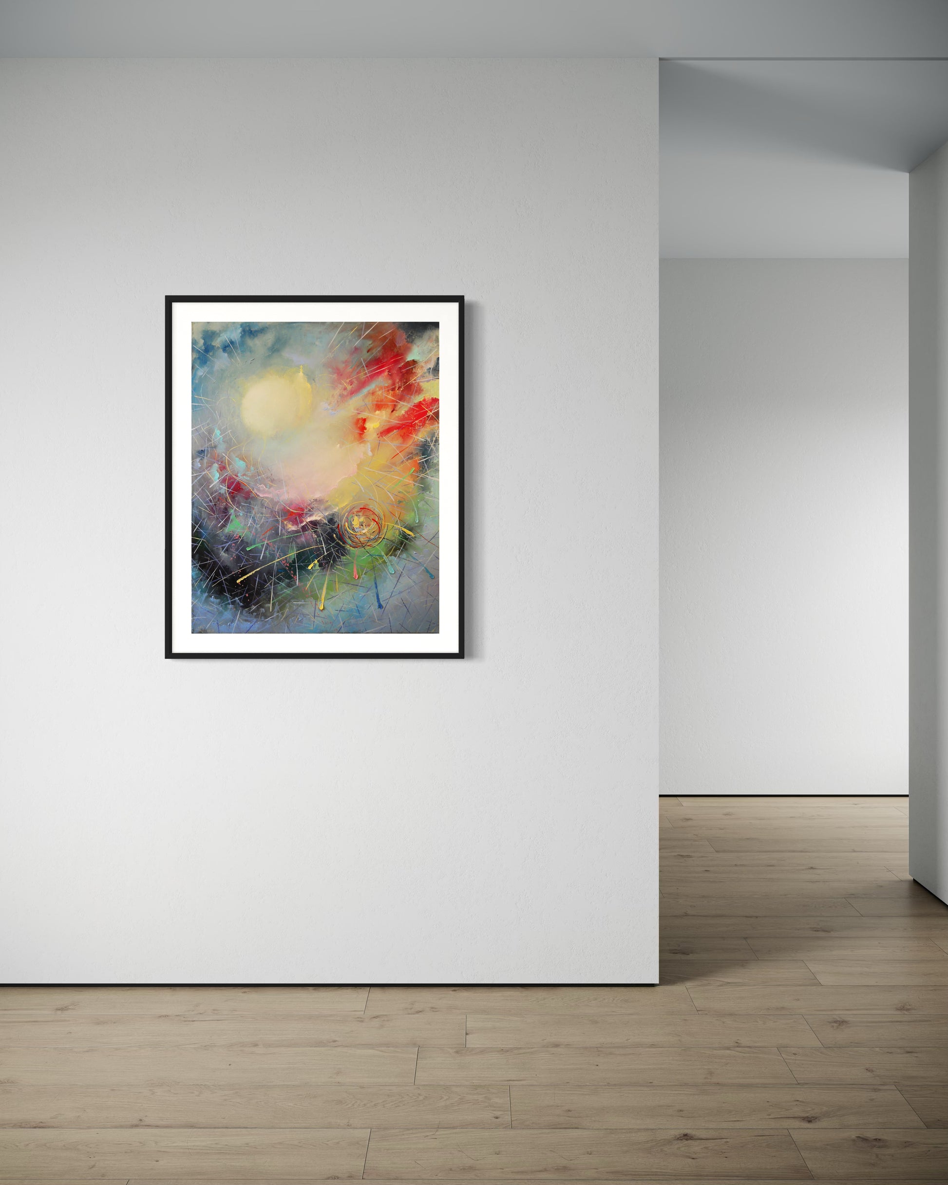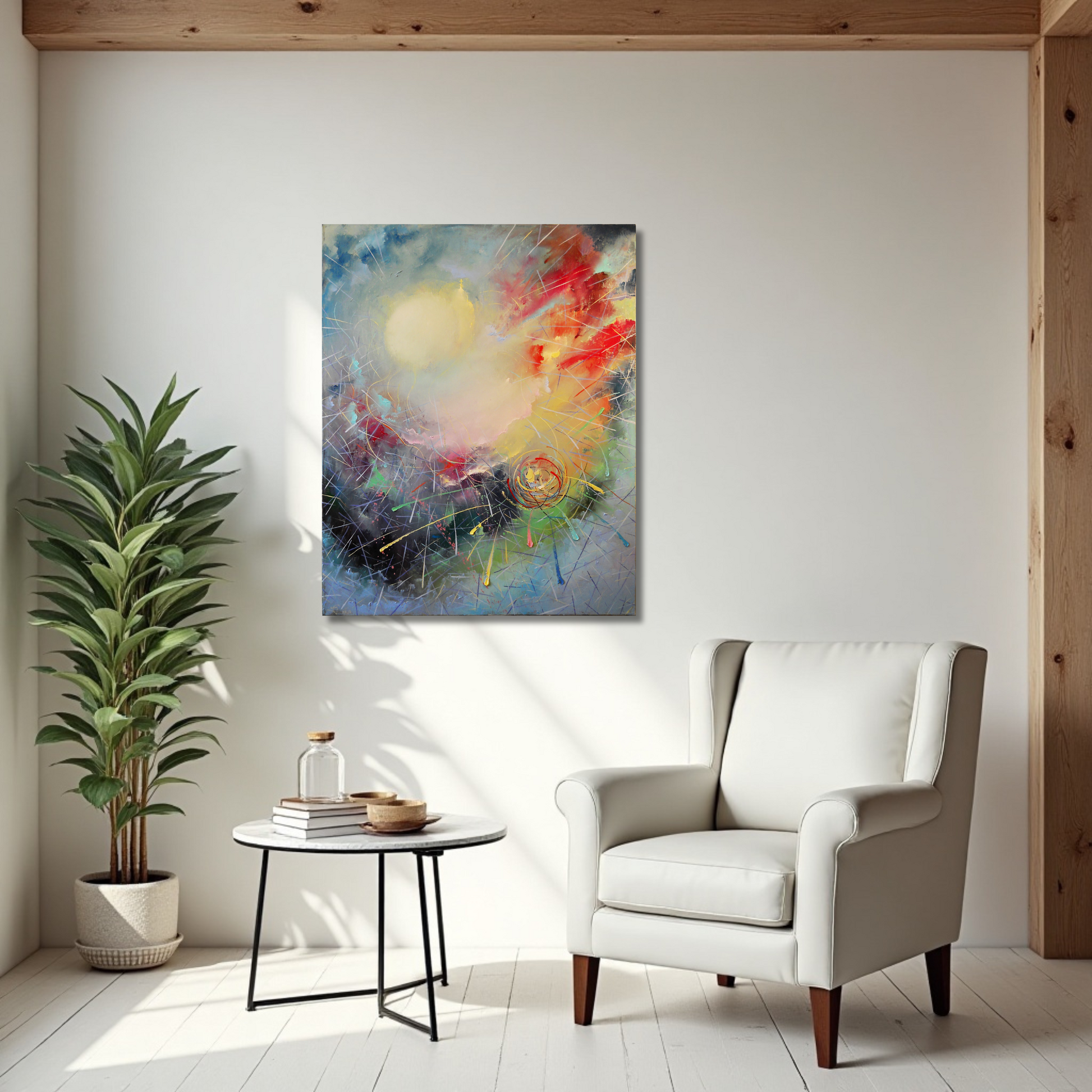 A quiet collision of chaos and calm, where thoughts scatter like comets, yet something soft and golden holds it all together.
