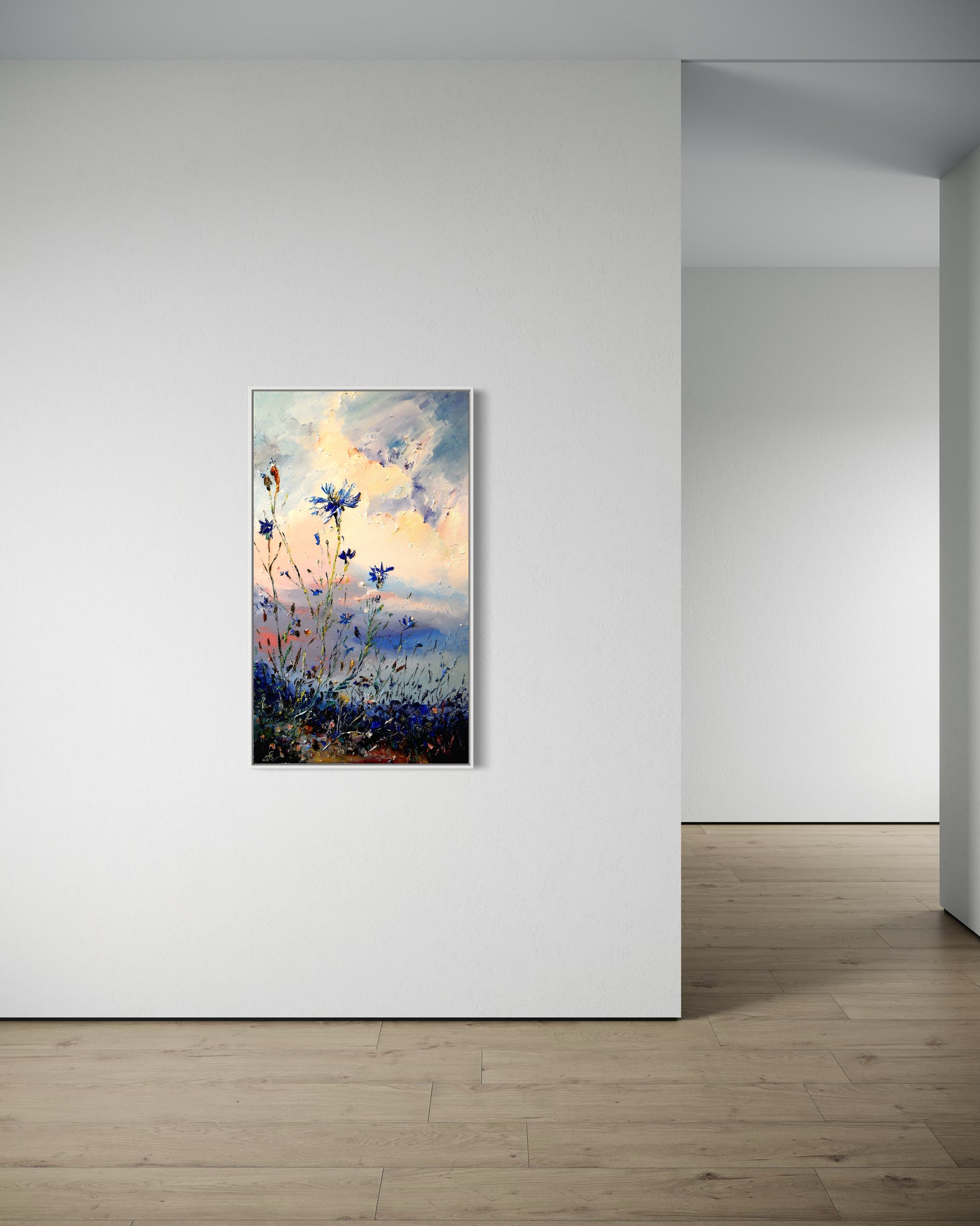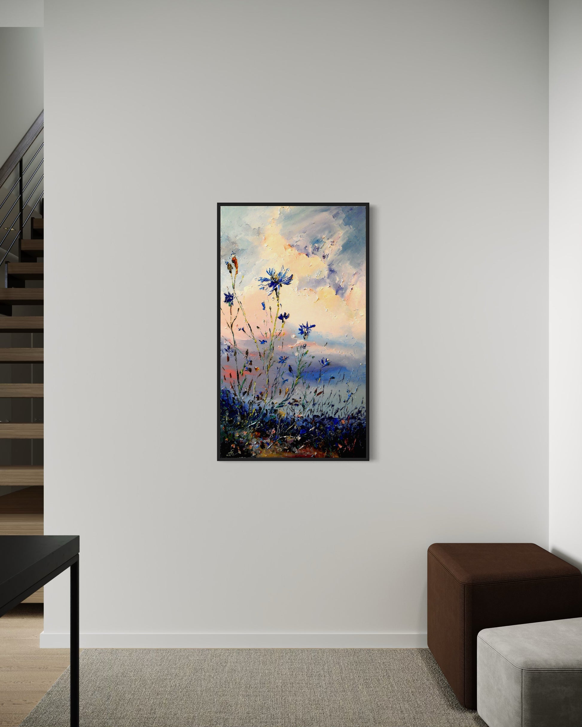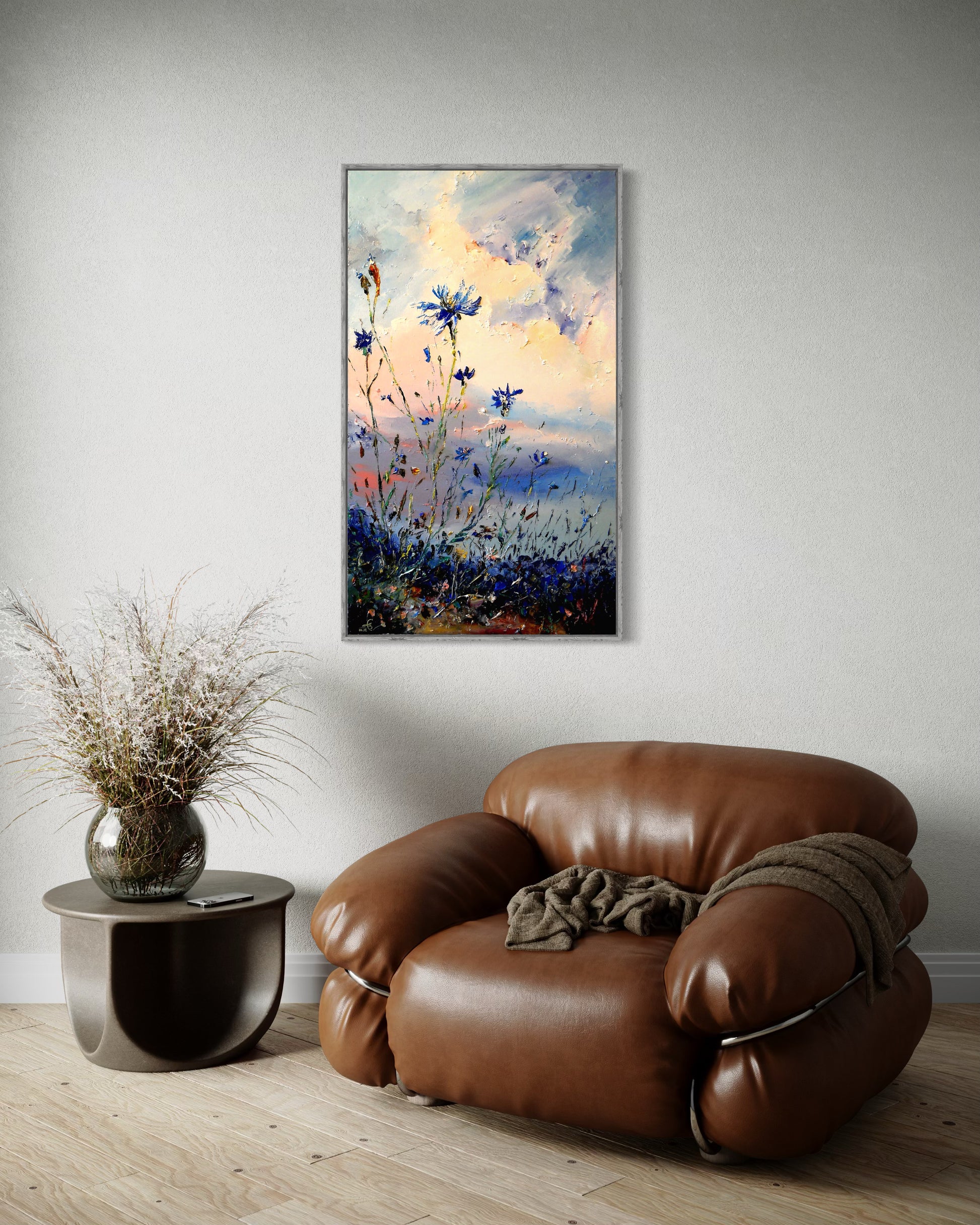 Delicate blue wildflowers reach skyward as if carried by the breeze itself, untamed, weightless, and full of quiet strength. The sky softens behind them, like a sigh at the edge of day.