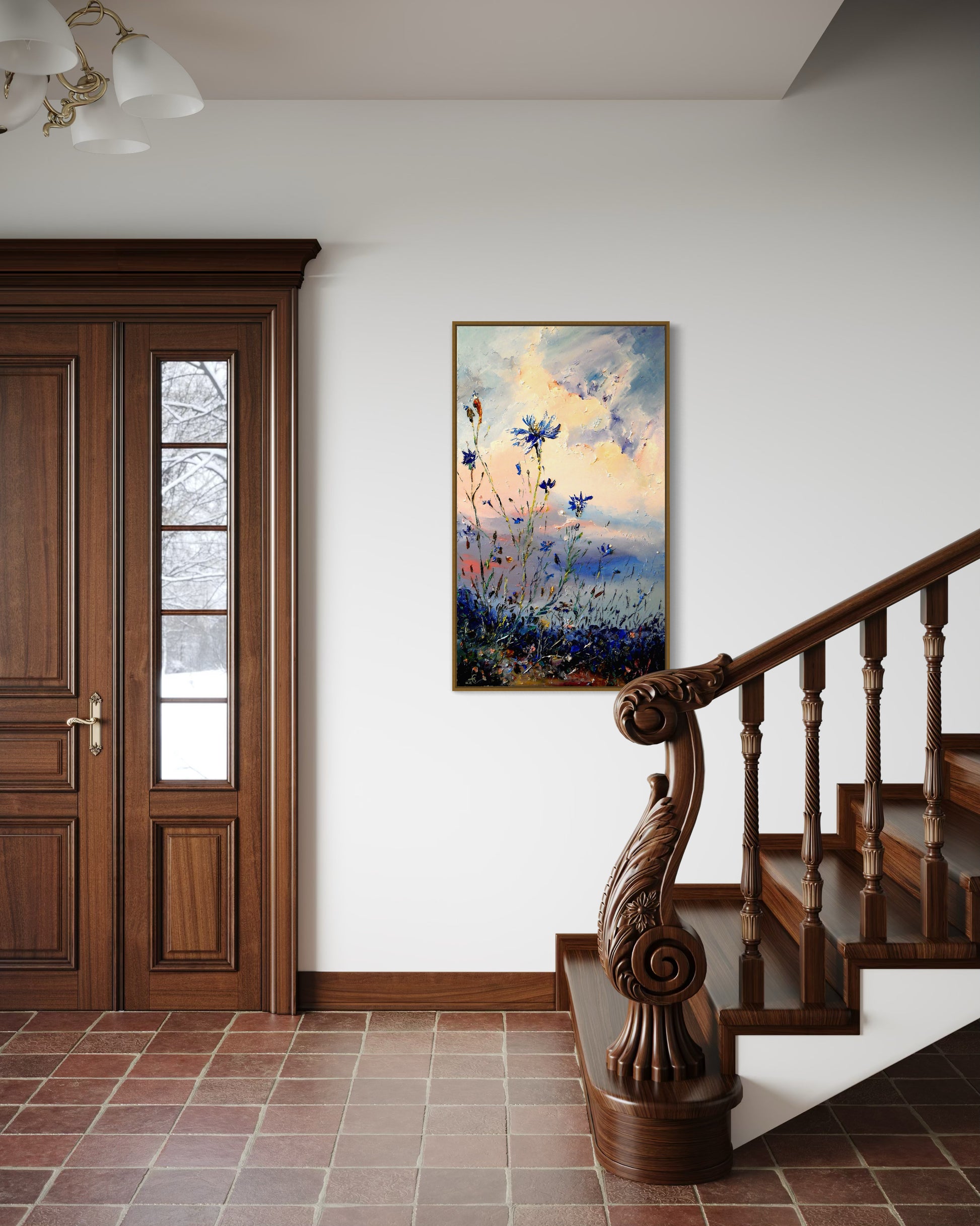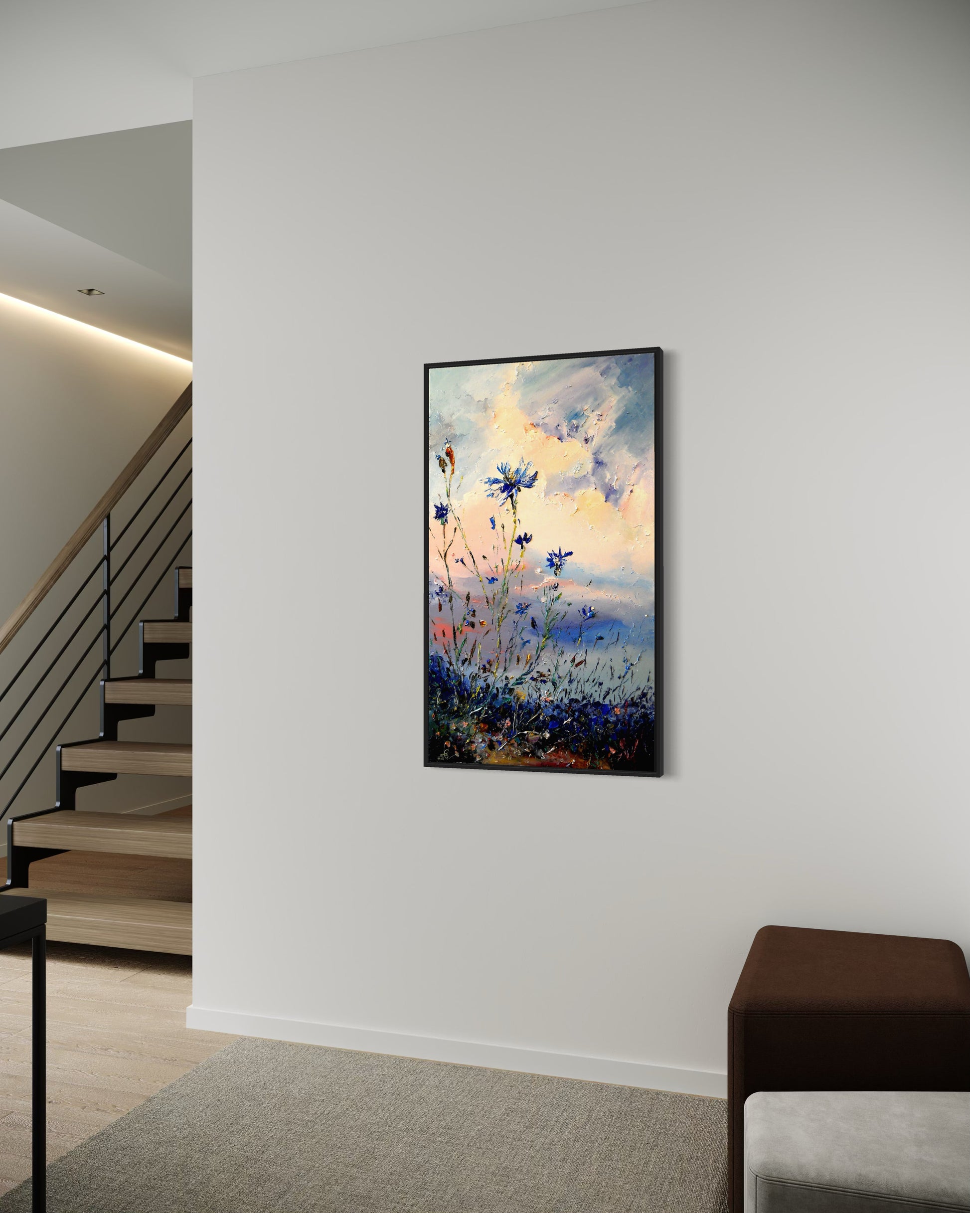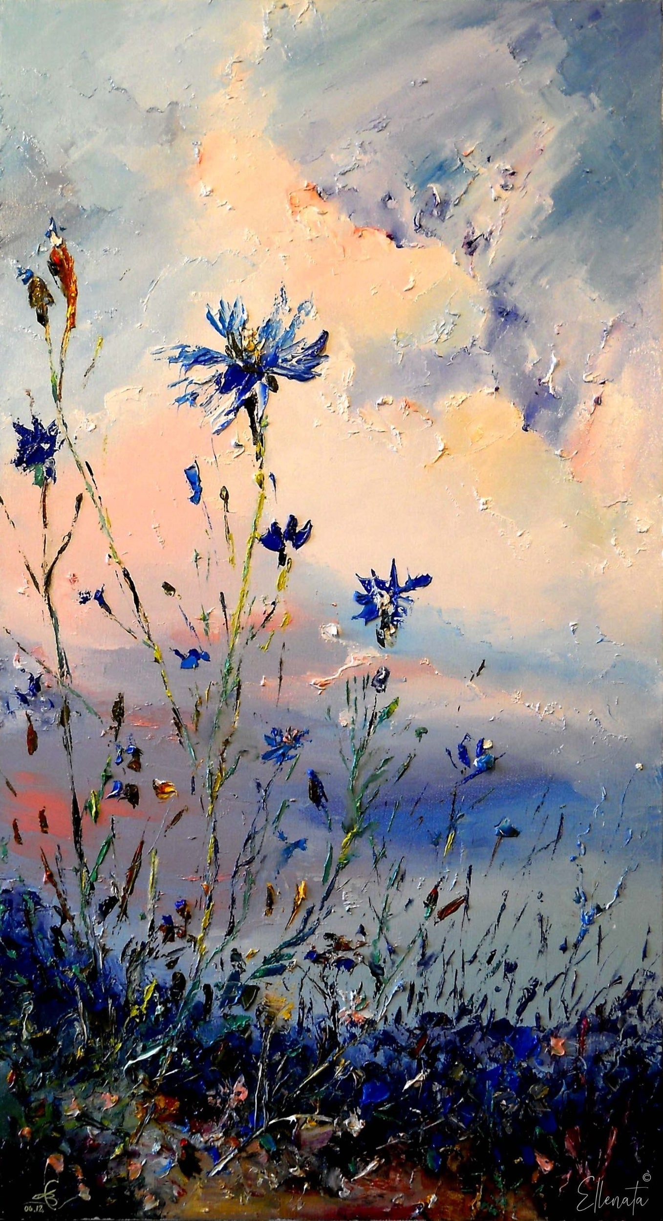 Delicate blue wildflowers reach skyward as if carried by the breeze itself, untamed, weightless, and full of quiet strength. The sky softens behind them, like a sigh at the edge of day.