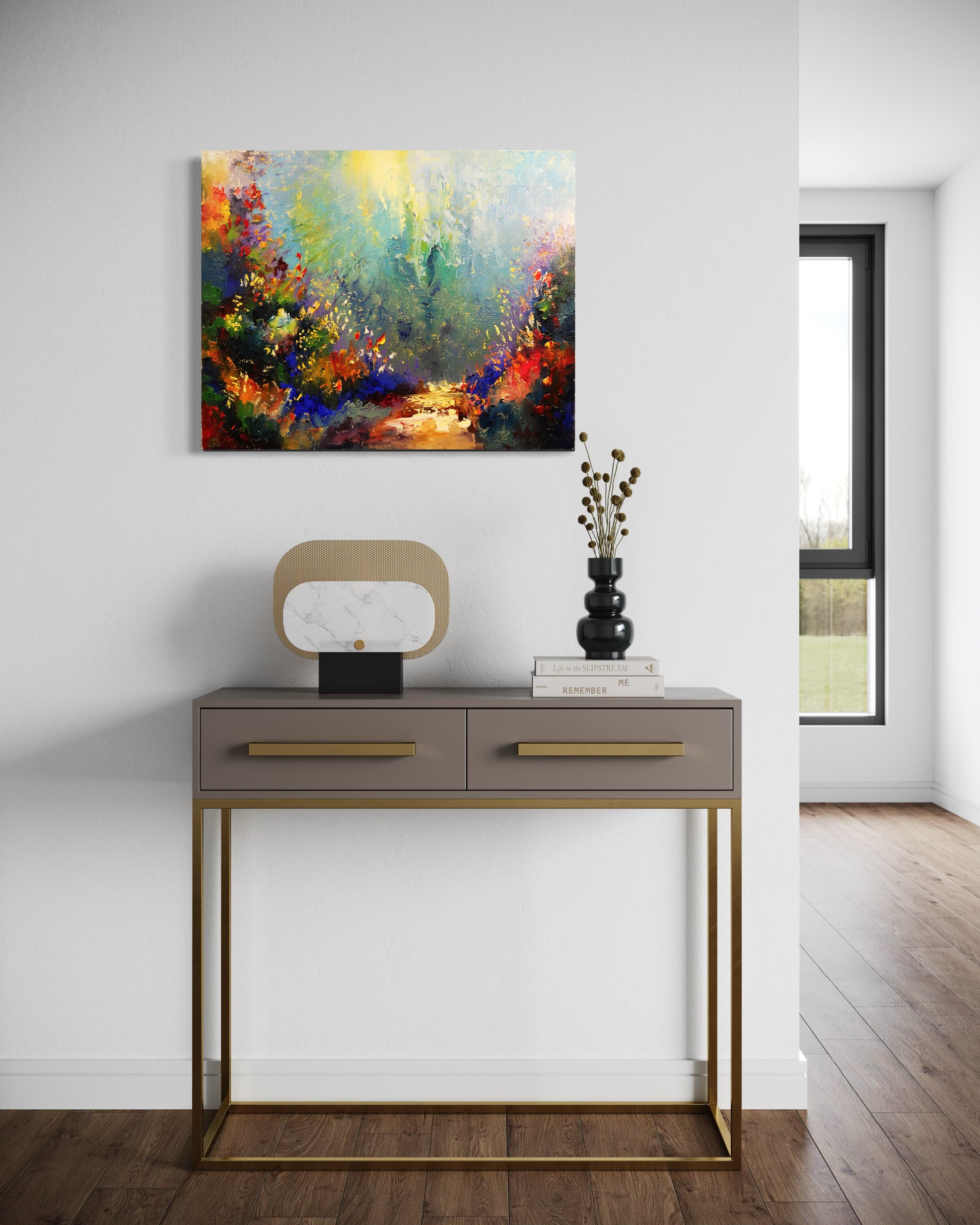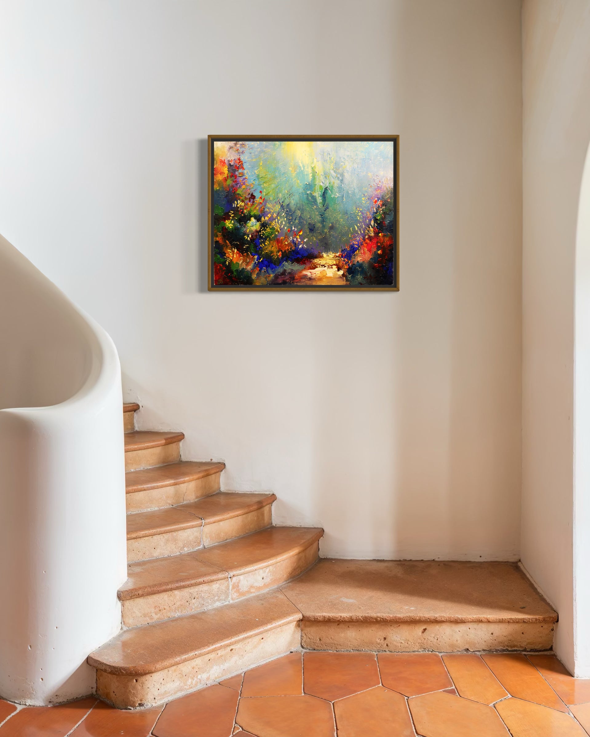 A golden path winds through a riot of color, where sunlight spills like a gentle waterfall onto wild petals and tangled leaves. Everything shimmers, not from movement, but from the quiet glow of being seen.