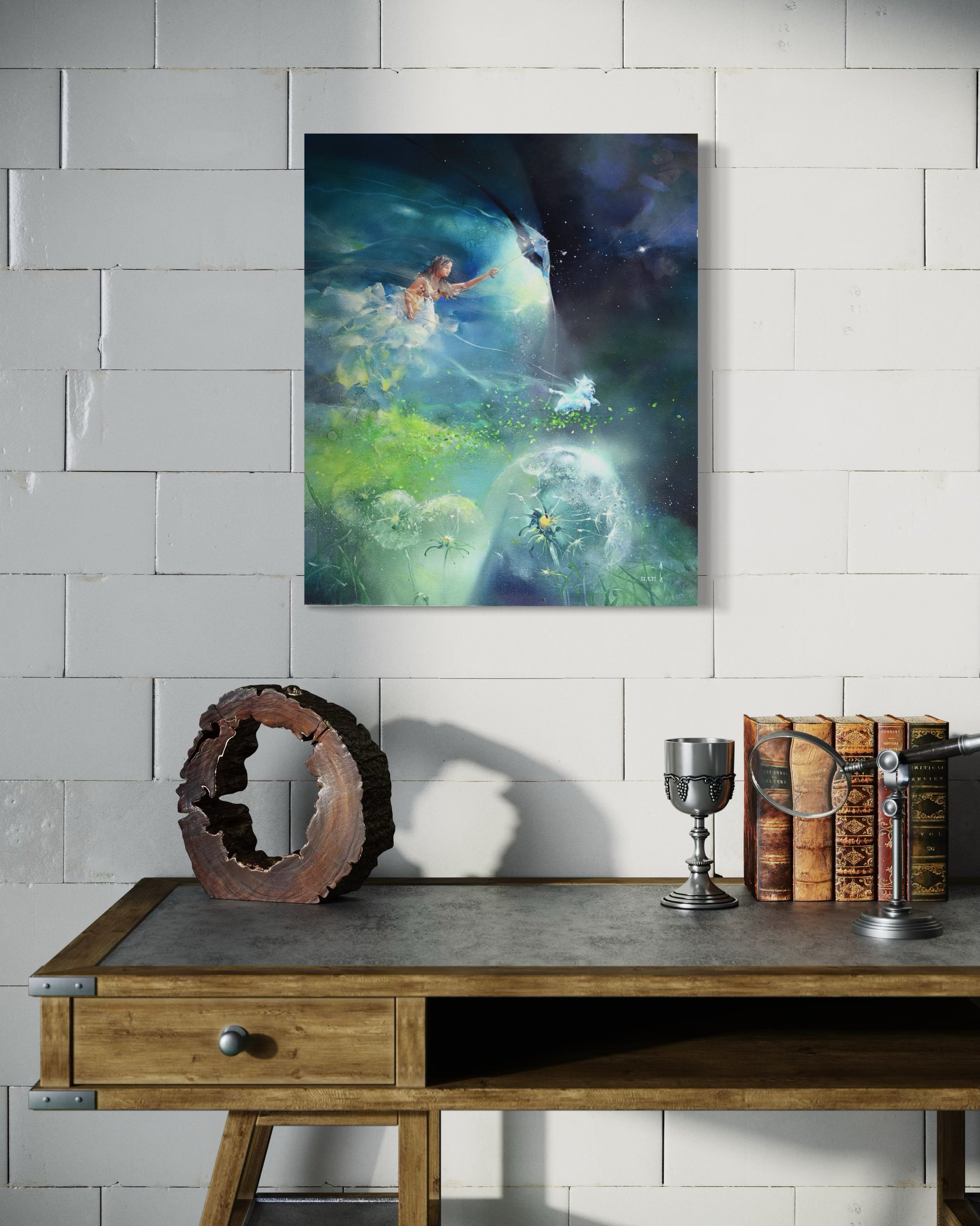 She held tight to the umbrella of starlight, gliding across dandelion moons and emerald winds, while a small glowing creature leapt beside her, as if joy itself had taken shape just to follow.