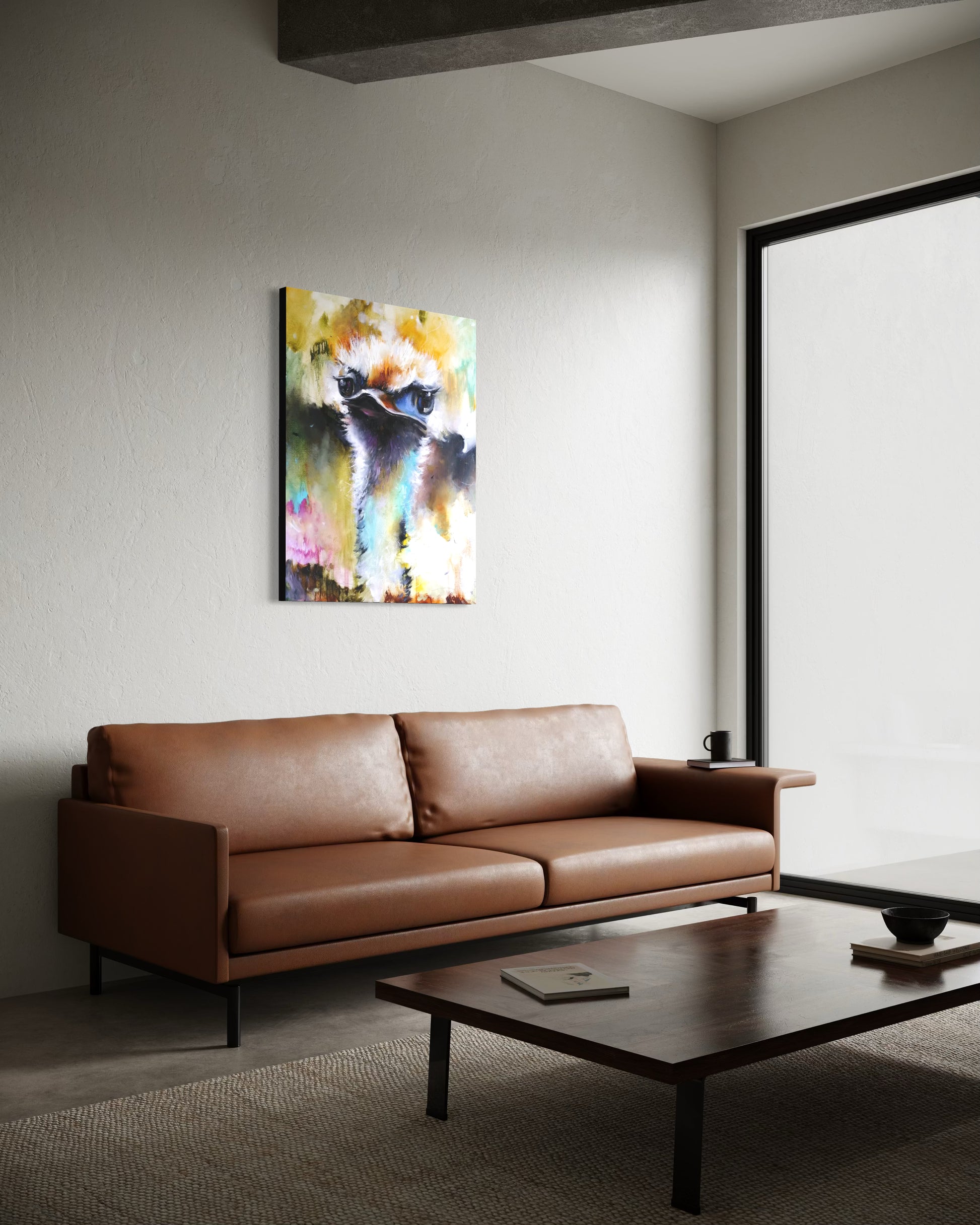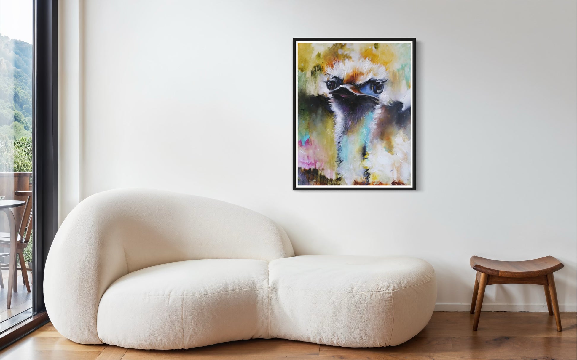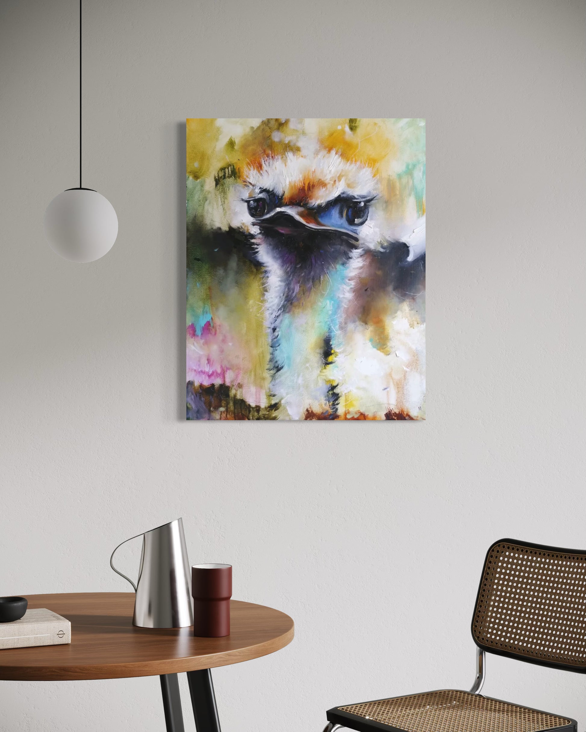 It stares straight at you, feathers wild, gaze unbothered, unblinking. The background is chaos and color, but the question is clear in its eyes: So, what?
