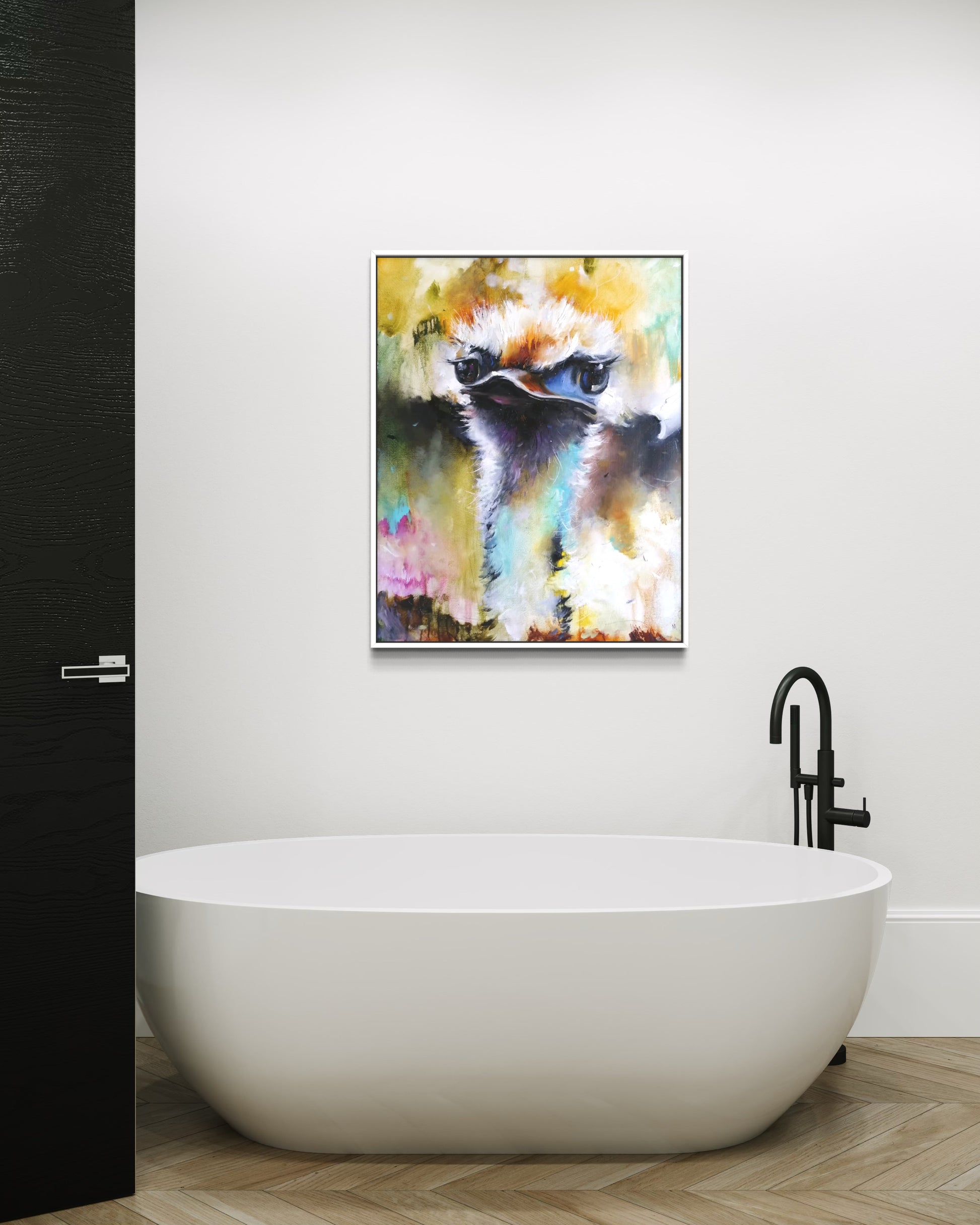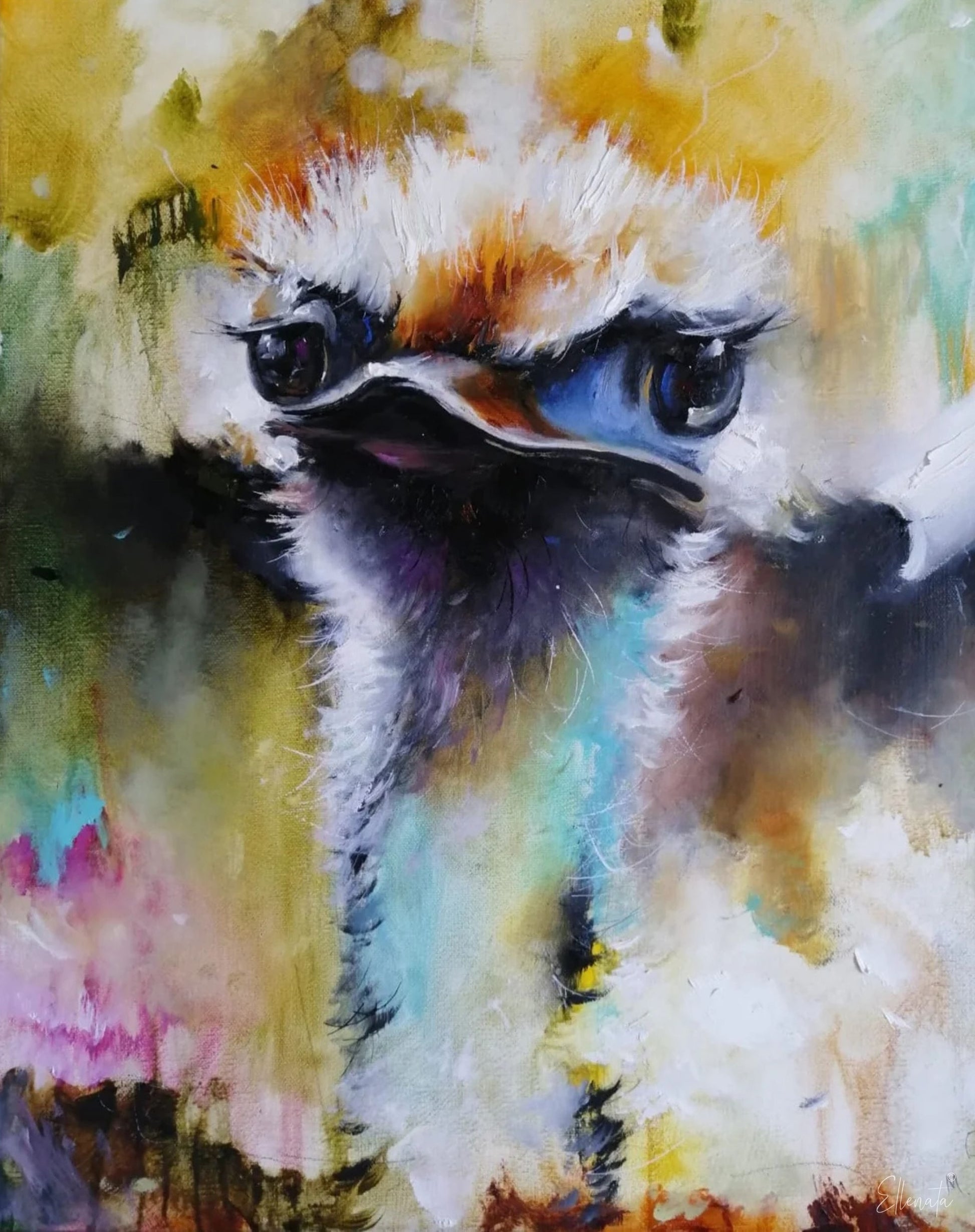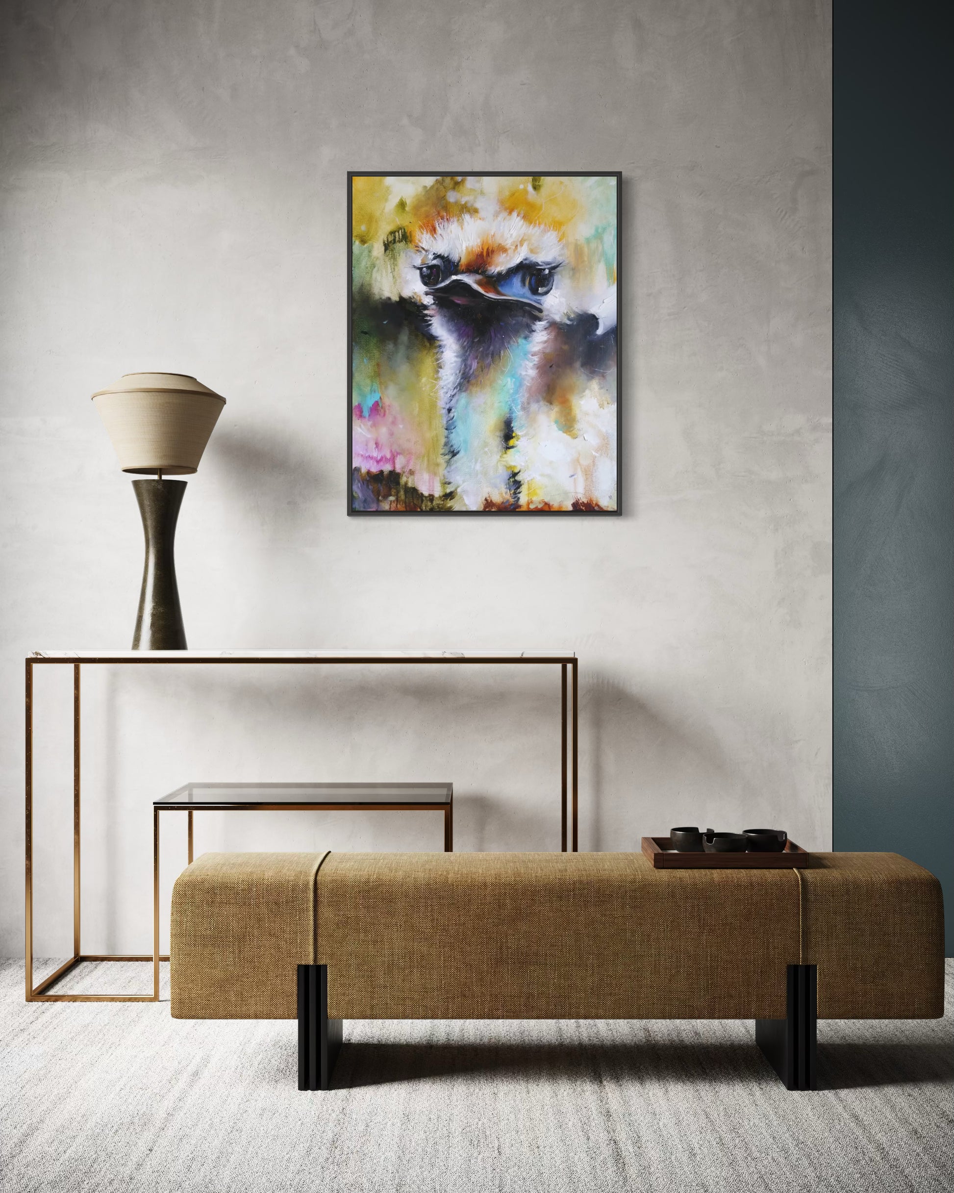 It stares straight at you, feathers wild, gaze unbothered, unblinking. The background is chaos and color, but the question is clear in its eyes: So, what?