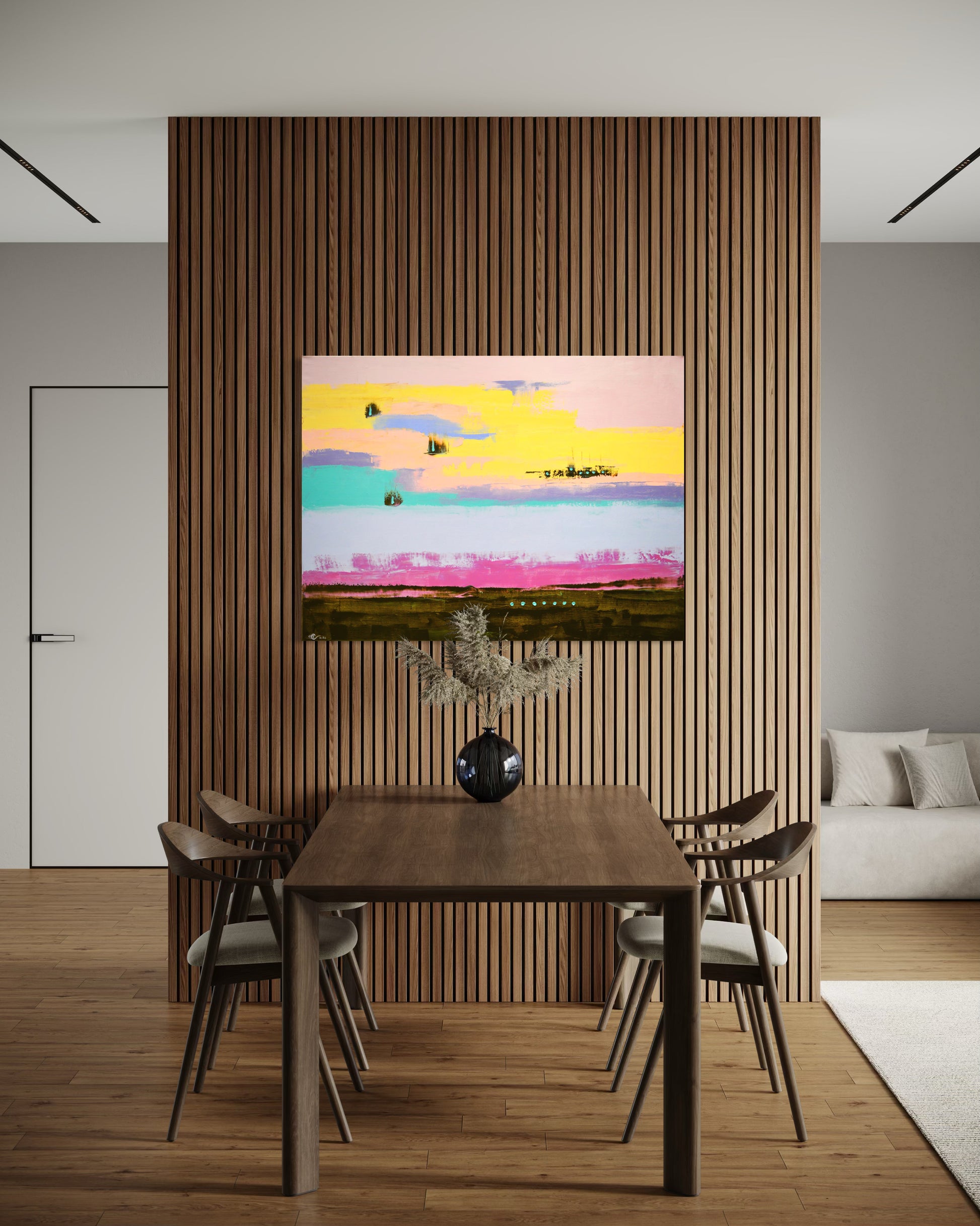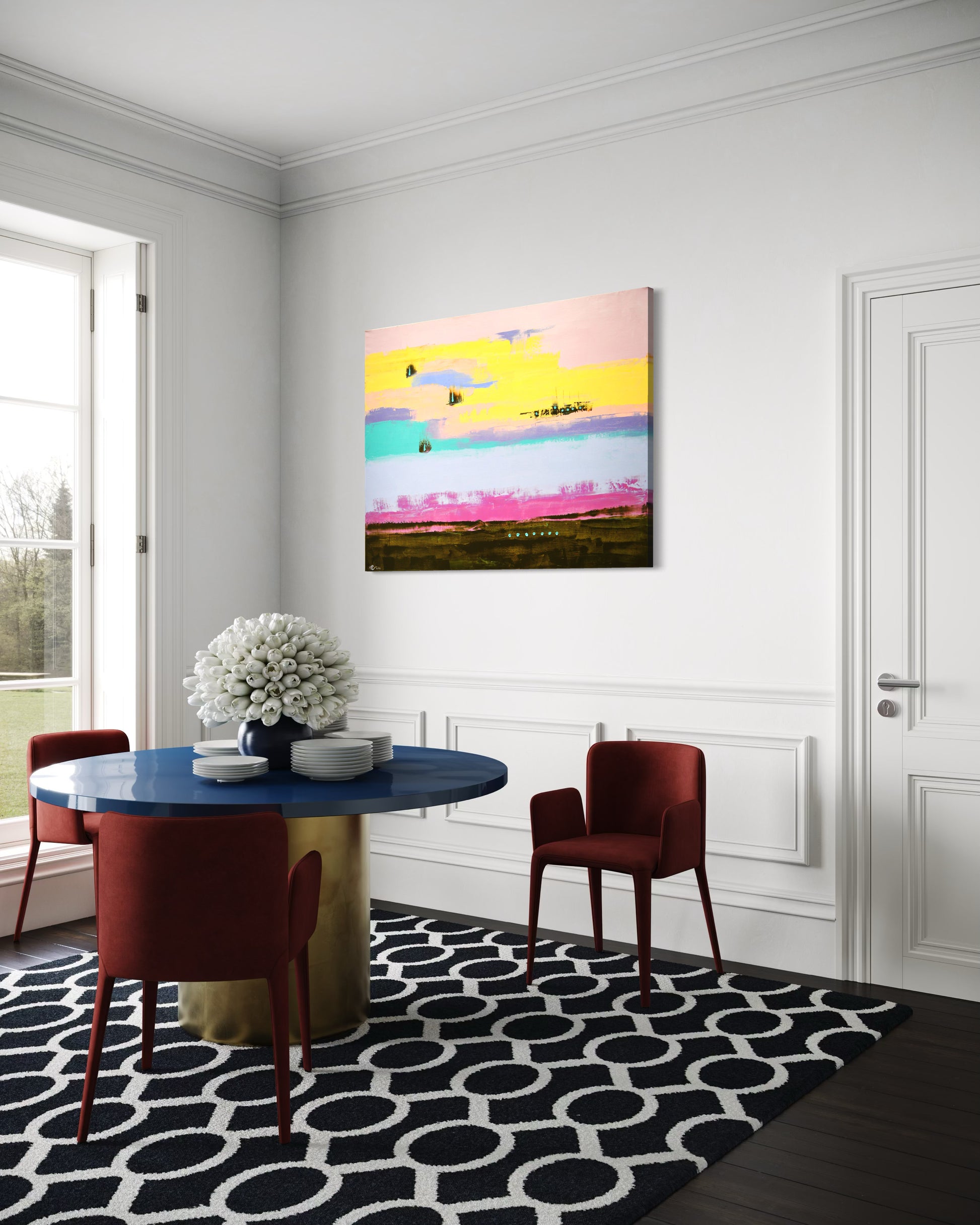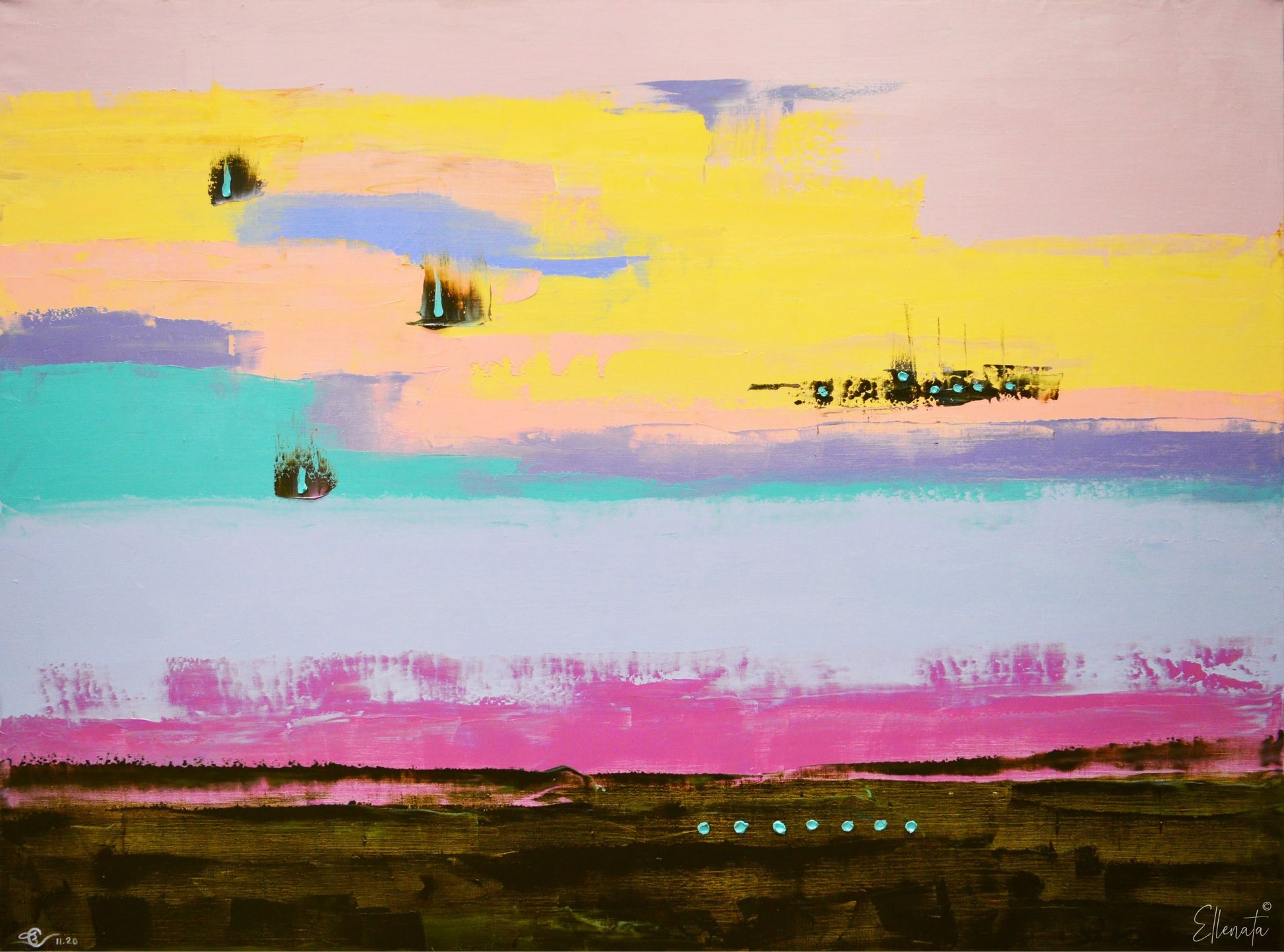 A vision of tomorrow painted in layers of light-pinks, yellows, and blues float like fragments of a dream. Ships drift through color fields, and tiny dots pulse like signals from another age, charting a course through the unknown.